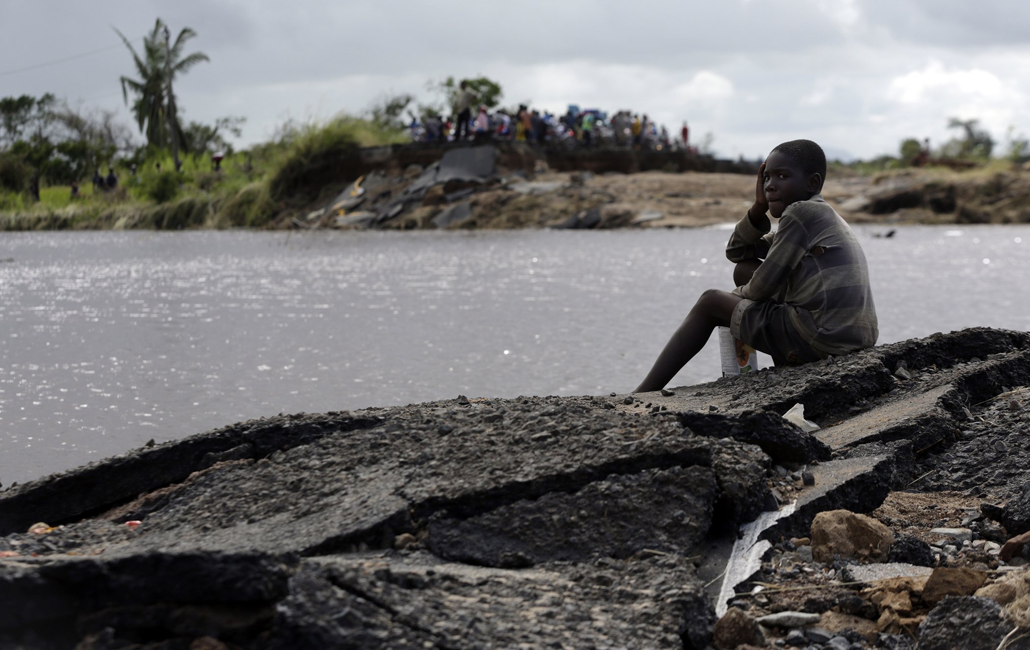 A young boy sits on the edge of a collapsed bridge in Nhamatanda, about 100km west of Beira, Mozambique, March 21, 2019.