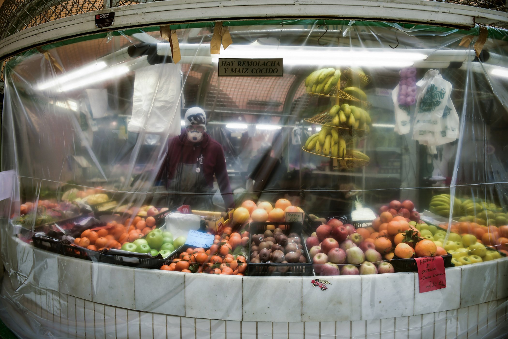 A worker wearing a face mask stands inside of a stall covered with a piece of plastic to prevent the spread of coronavirus, at a market in Pamplona, Spain on April 2, 2020. Grocery workers across the globe are working the front lines during lockdowns.