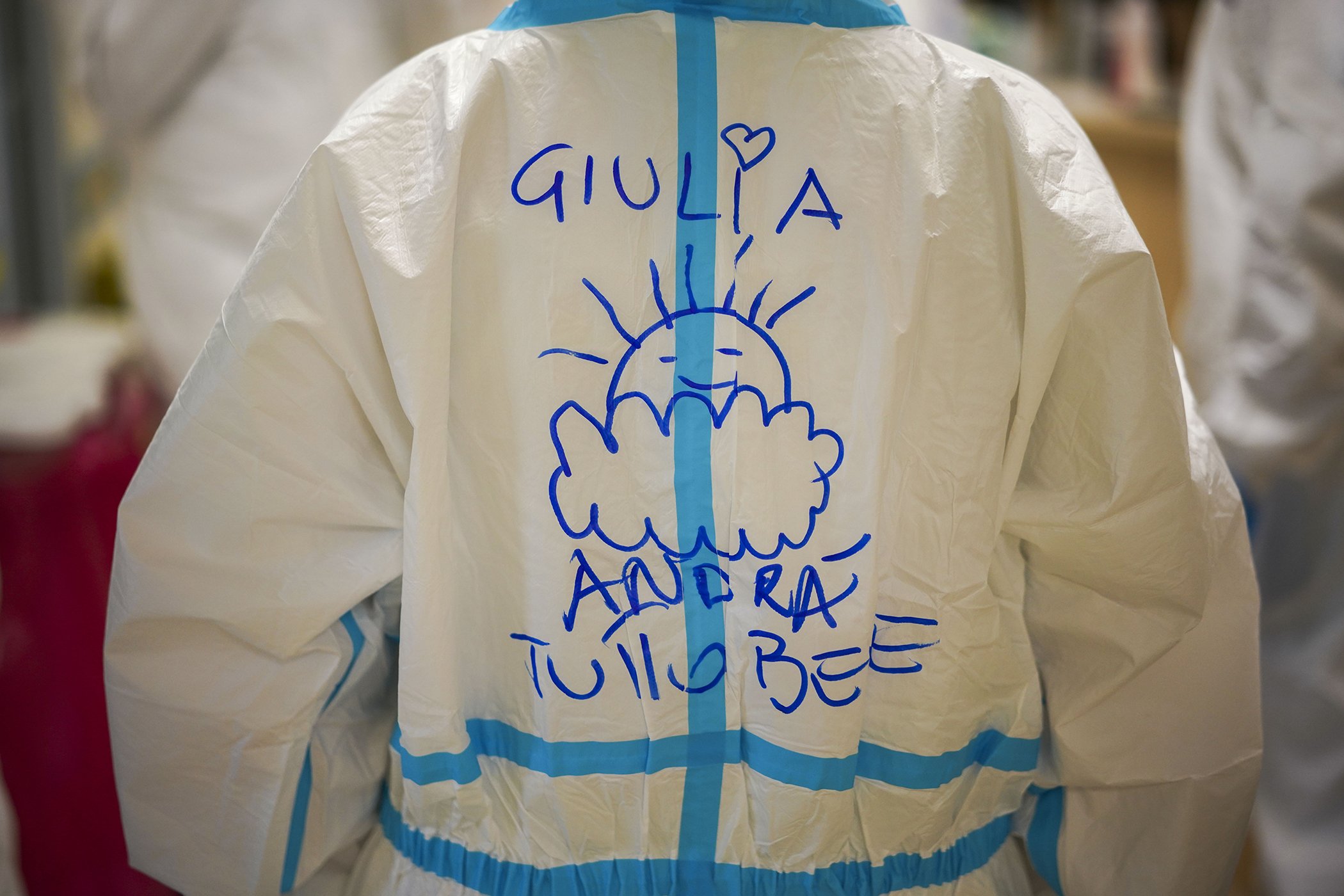 A medical staffer, her first name Giulia and a smiling sun with the sentence everything will be fine painted on her protective outfit, works in the ICU unit of Rome's San Filippo Neri Hospital's Covid department, April 9, 2020.