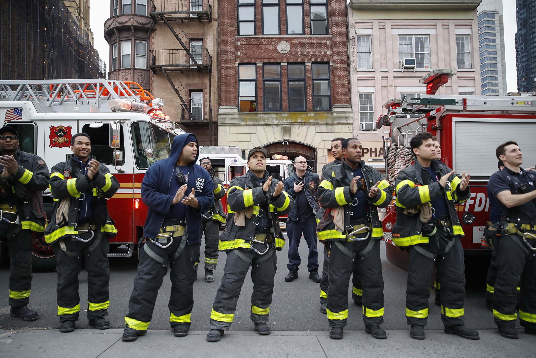 FDNY firefighters gather to applaud medical workers at 7pm outside Brooklyn Hospital Center, April 14, 2020, in New York.