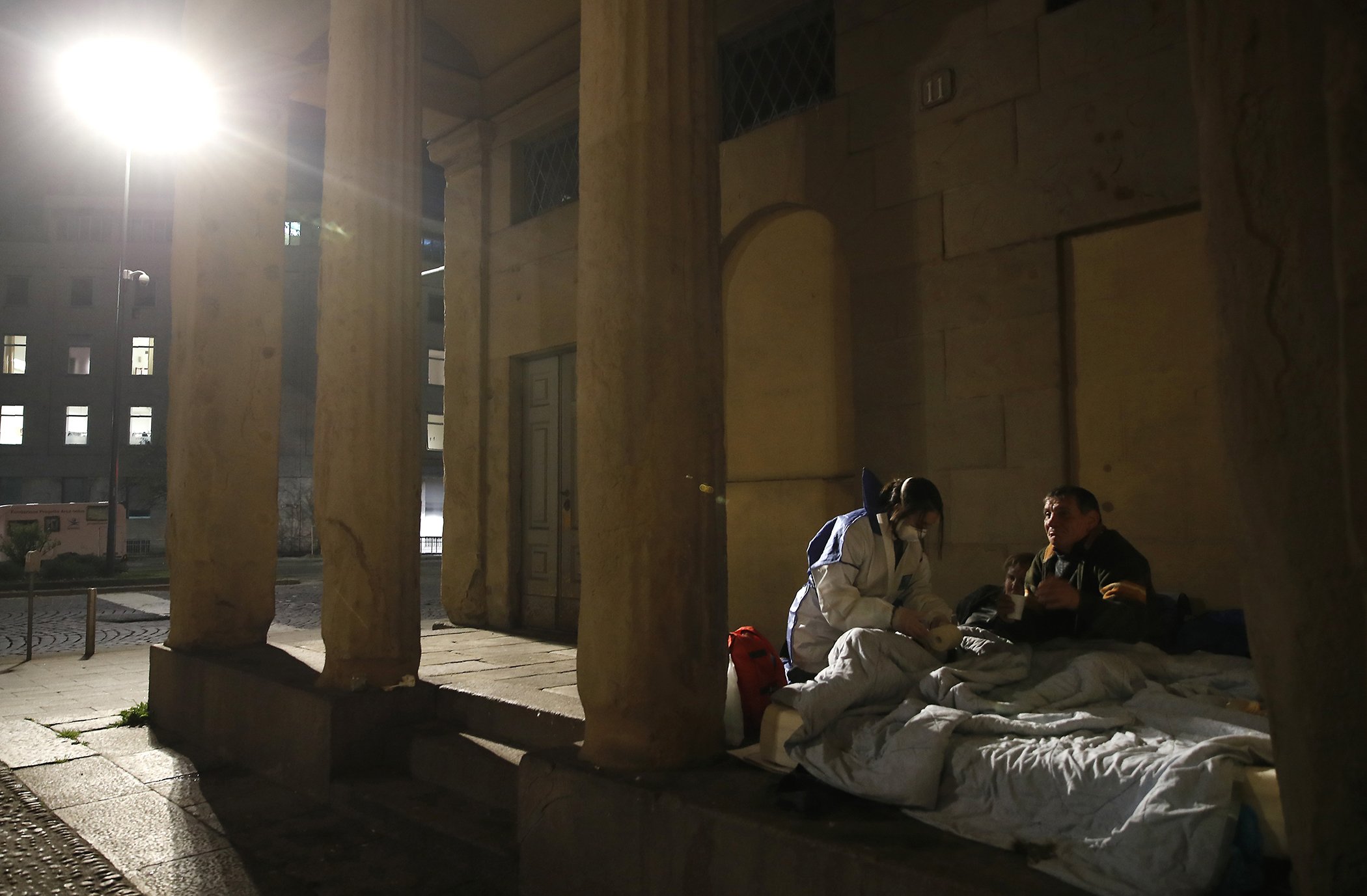 A volunteer nurse wearing a mask tends to homeless in Milan, March 24, 2020.