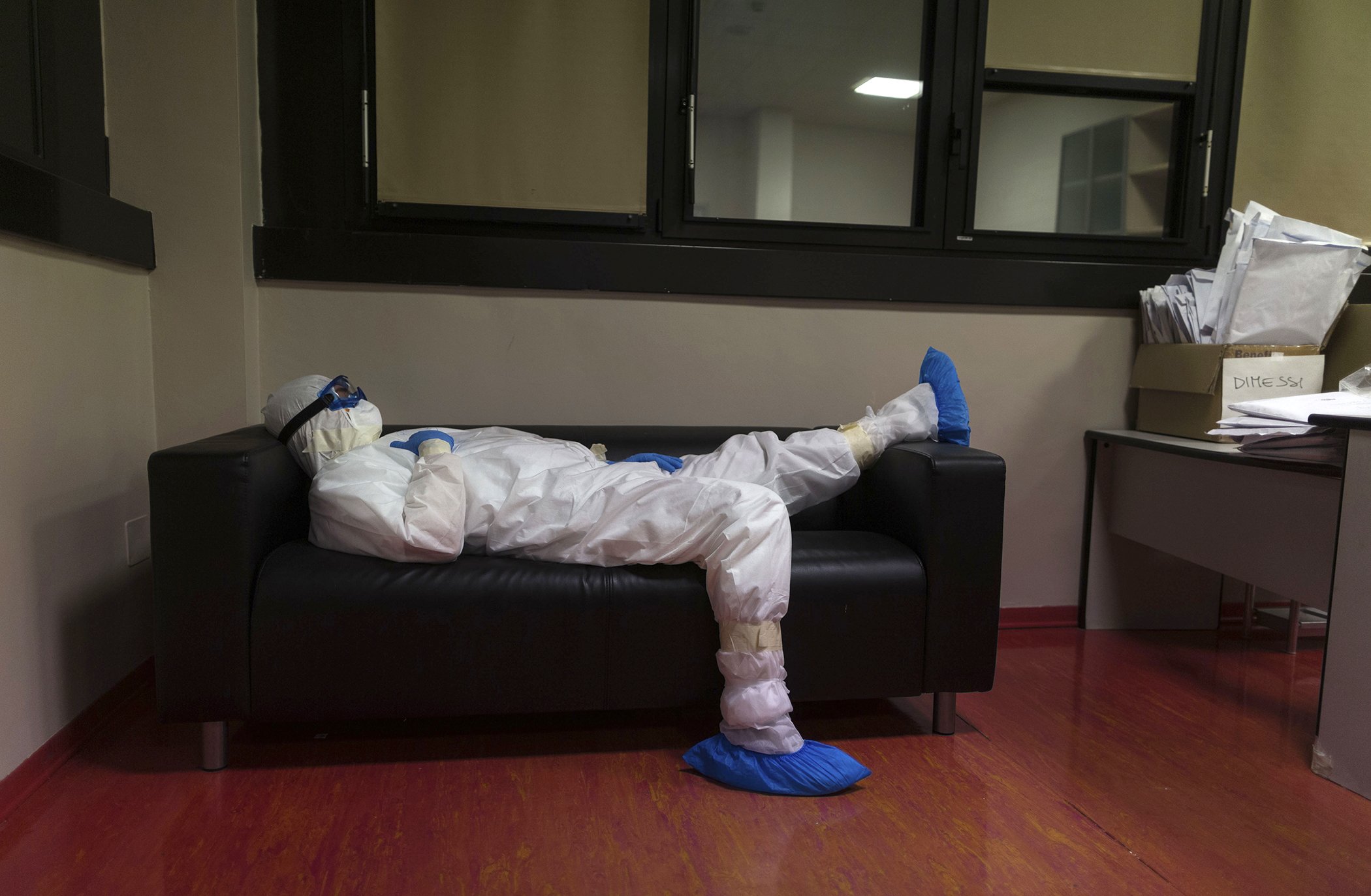 Doctor Giovanni Passeri rests in the doctor's lounge after completing a routine round of medical examinations during a night shift in his ward in the COVID-19 section of the Maggiore Hospital in Parma, northern Italy, April 8, 2020.
