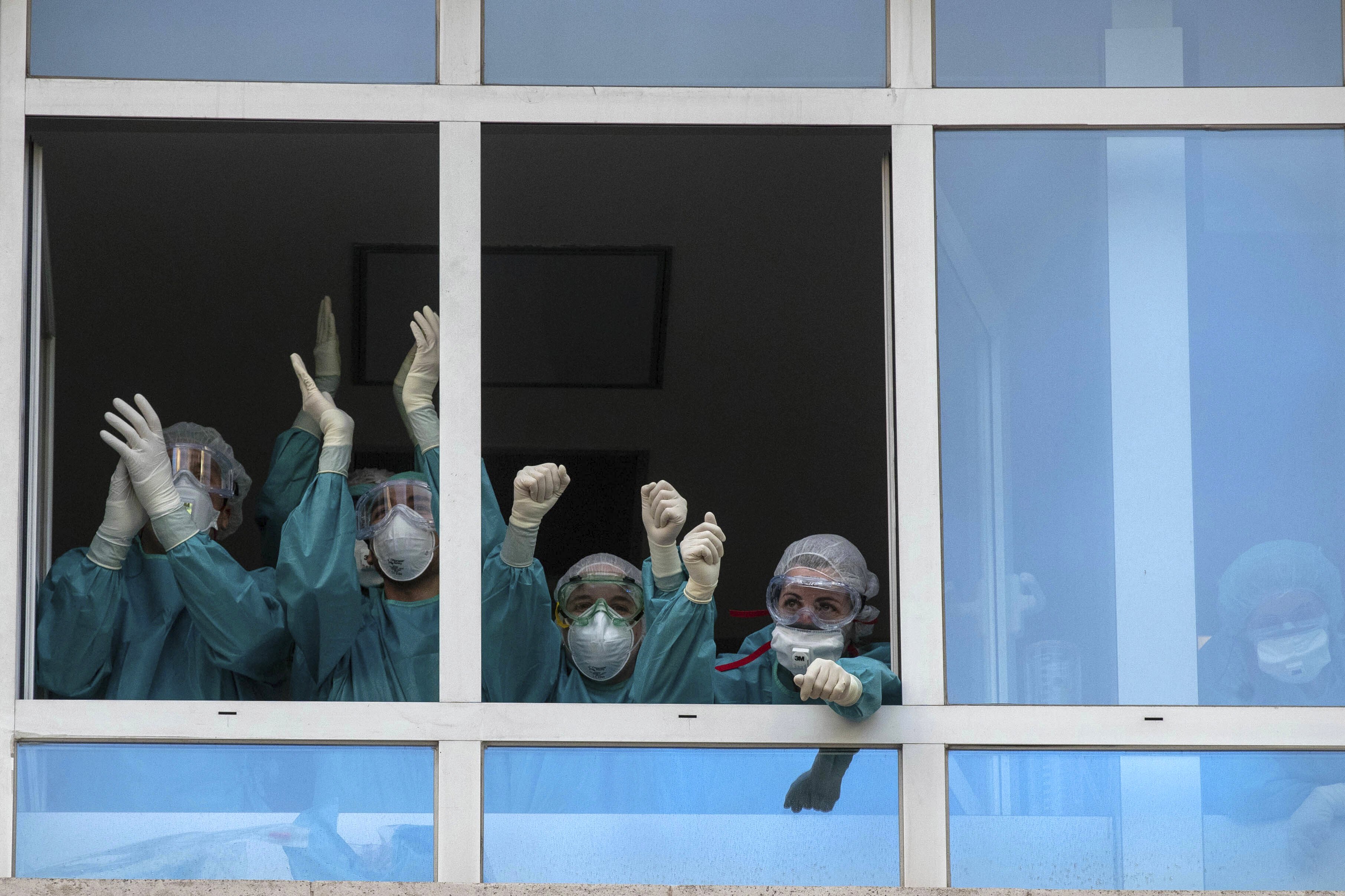 Medical staff wave from inside the ICU unit of the Covid 3 hospital in Casalpalocco, near Rome, April 11, 2020.