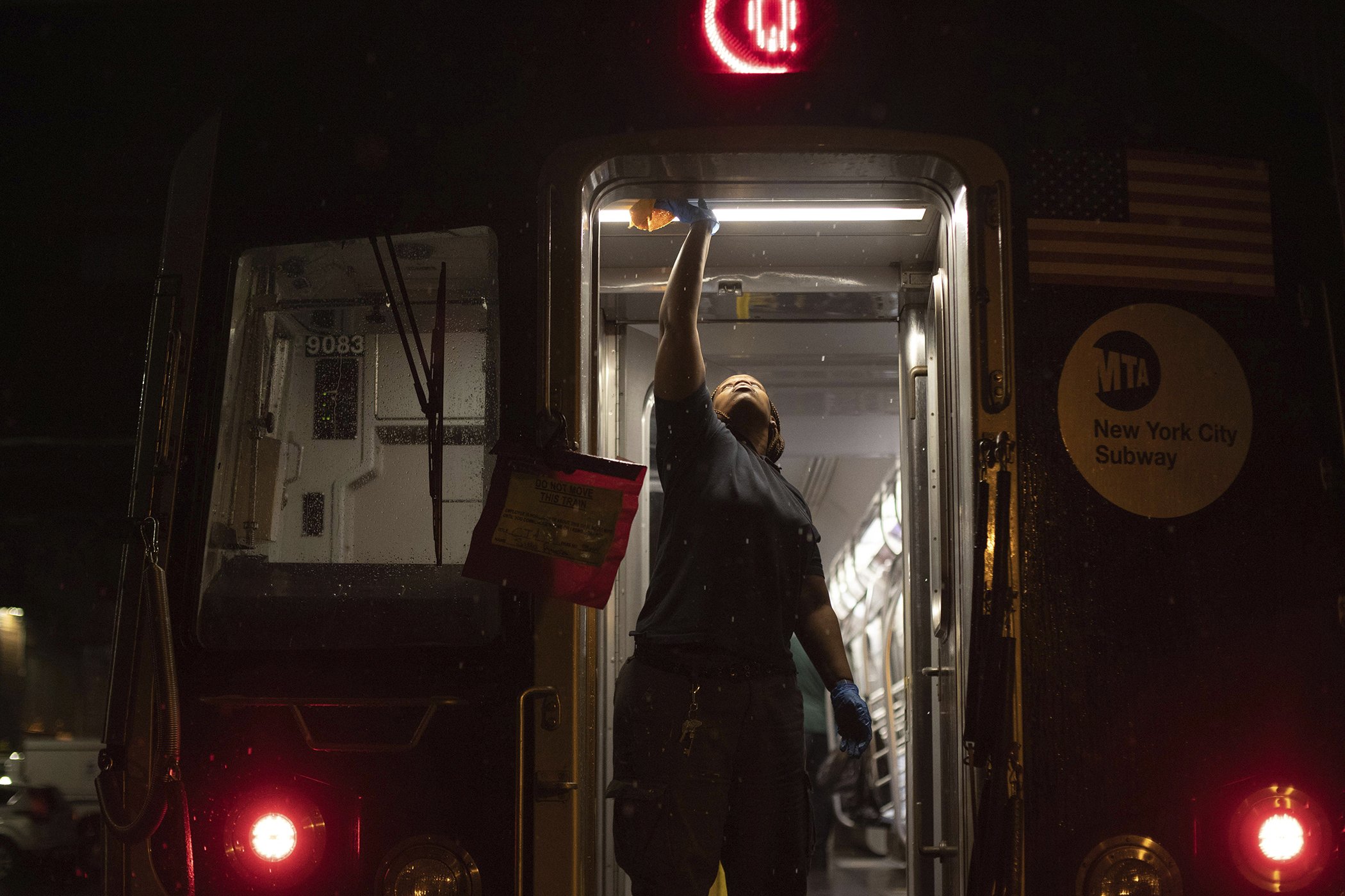A Metropolitan Transportation Authority worker sanitizes surfaces at the Coney Island Yard, March 3, 2020, in the Brooklyn borough of New York. The MTA is stepping up efforts to sanitize cars and stations as fears mount over the coronavirus.