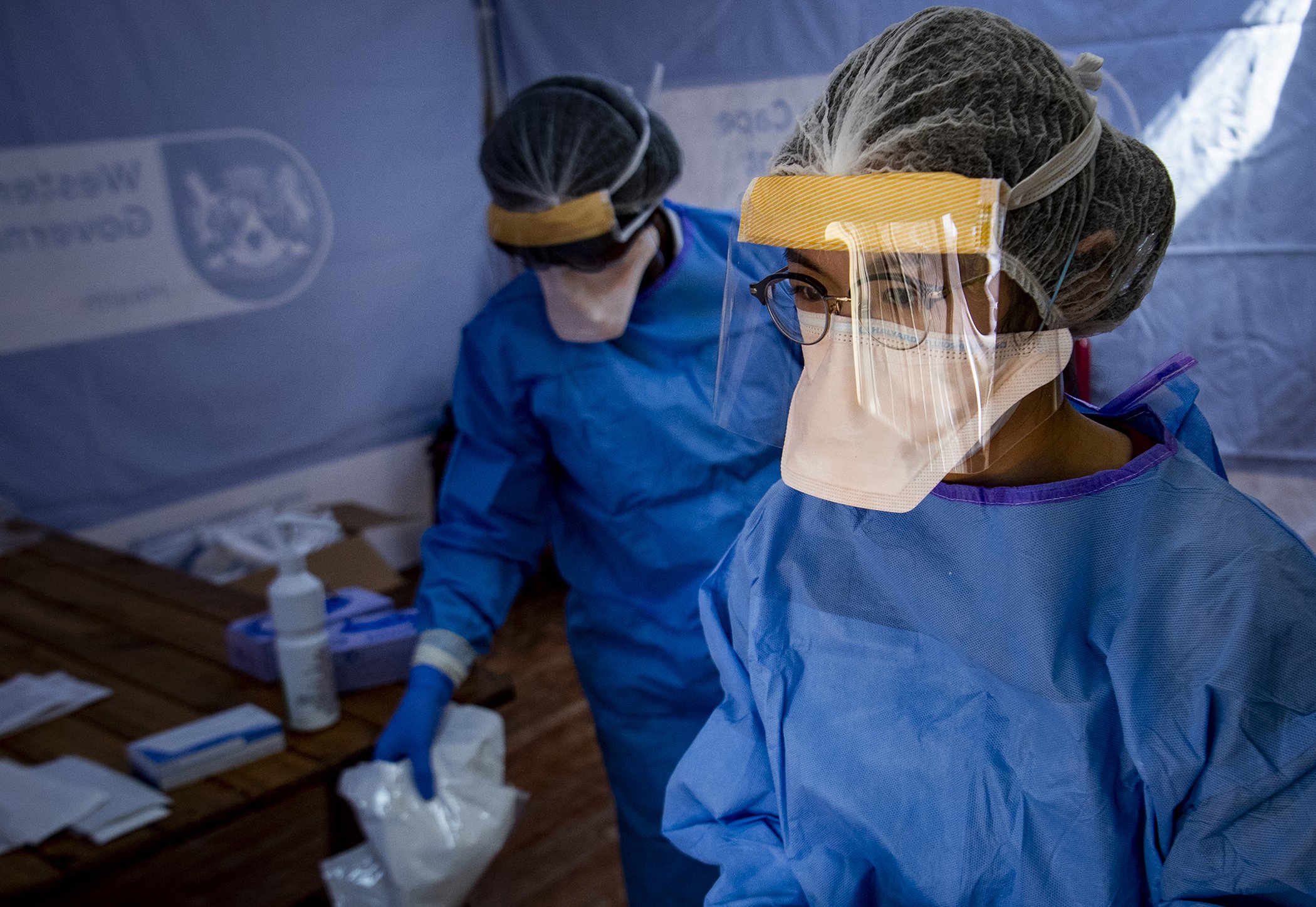 Medical workers prepare for COVID-19 testing in the Bo-Kaap neighborhood, Cape Town, South Africa, April 8, 2020 as South Africa remained on lockdown in an effort to control the spread of the coronavirus.