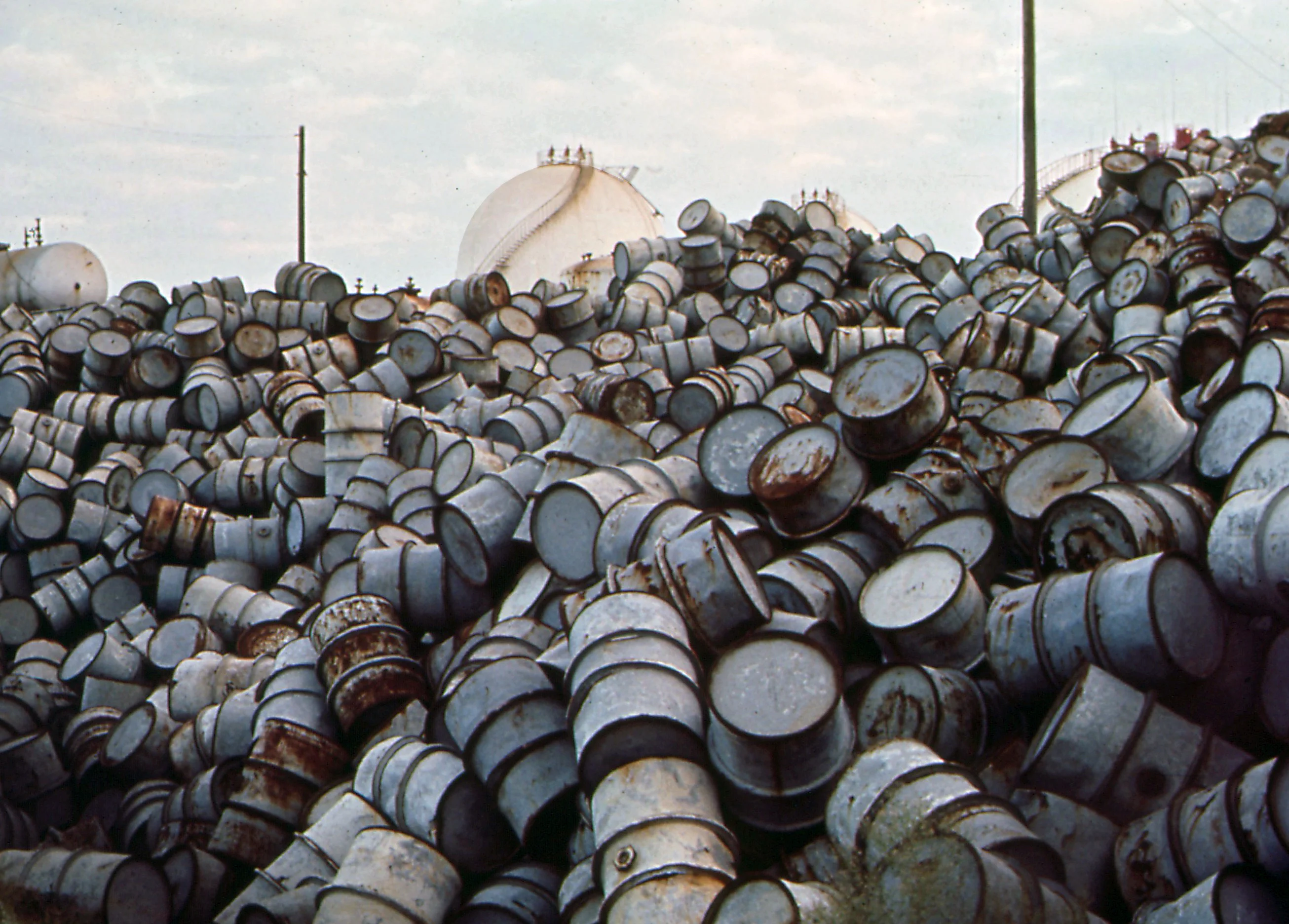 A mountain of damage oil drums near the Exxon refinery, in the Culp Creek drainage area of Oregon. Environmental Protection Agency, U.S. National Archives and Records Administration, Dec. 1972.