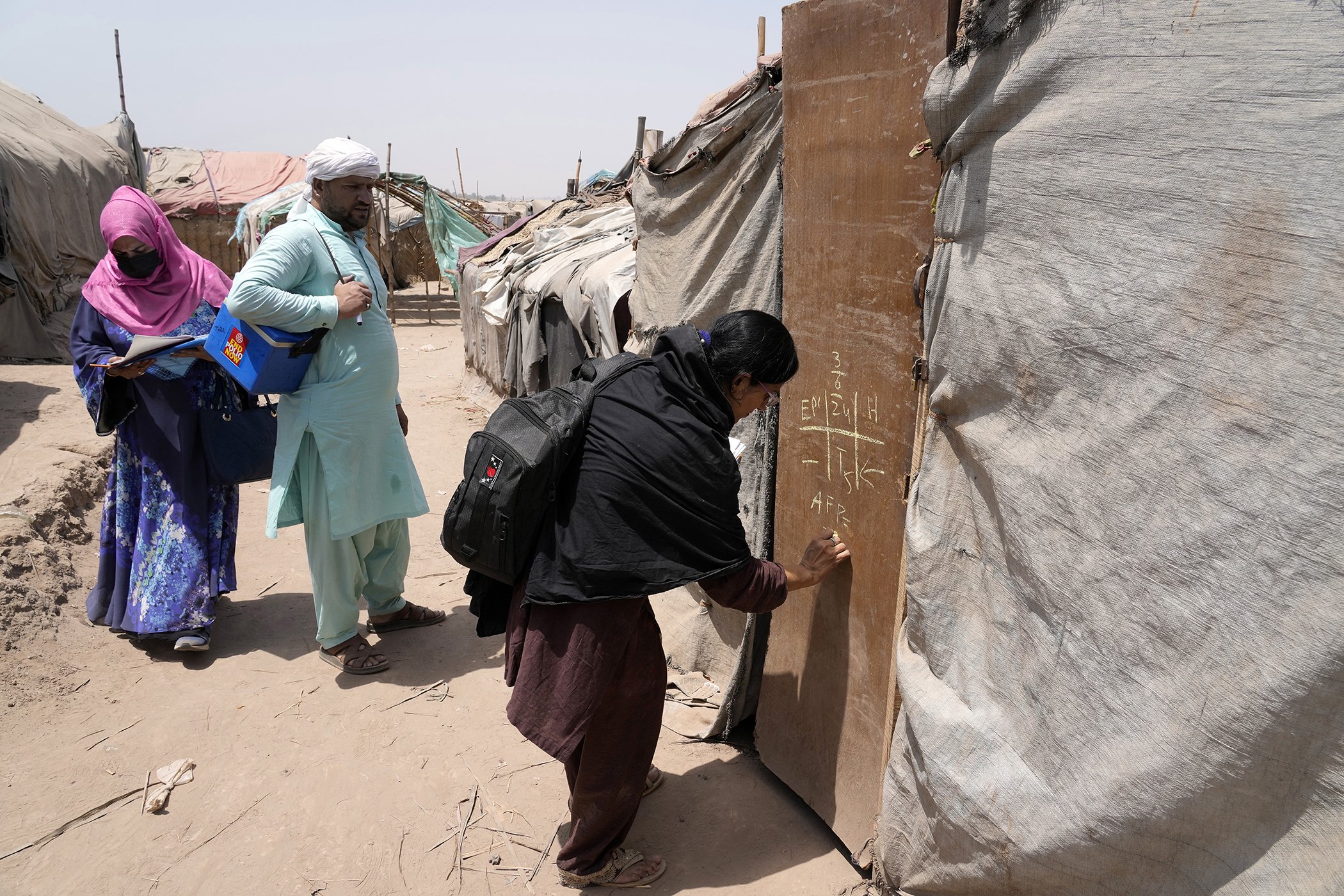 A health worker, right, marks a door of makeshift after administering the polio vaccine to children in a neighborhood of Lahore, Pakistan, June. 3, 2024.