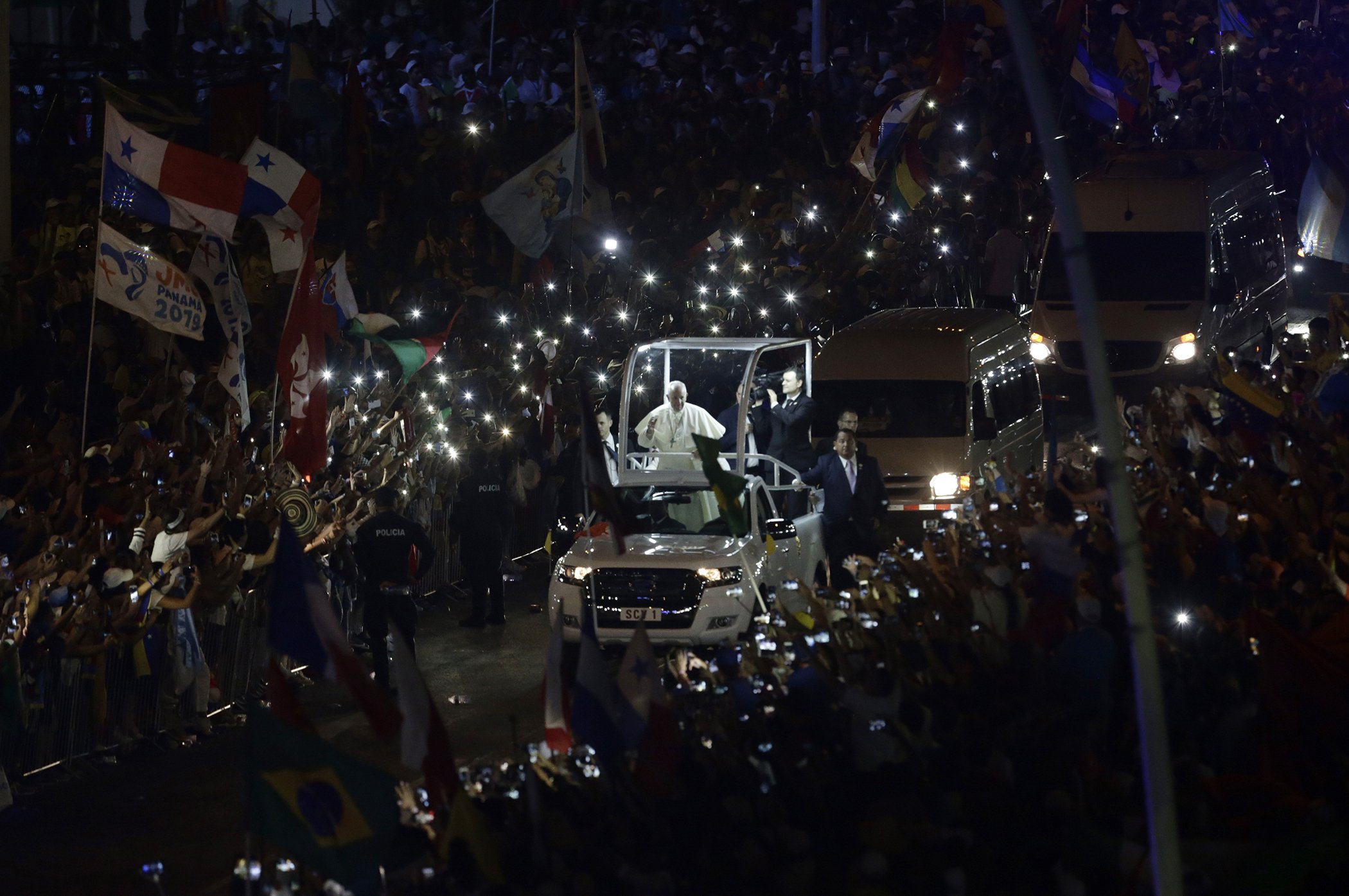 People hold up their cell phones as Pope Francis rides his popemobile in Panama City, Jan. 24, 2019. Pope Francis has arrived in Panama amid a political crisis in nearby Venezuela, a migration standoff over the proposed U.S.-Mexico border wall and tens of thousands of wildly excited young Central Americans welcoming him.