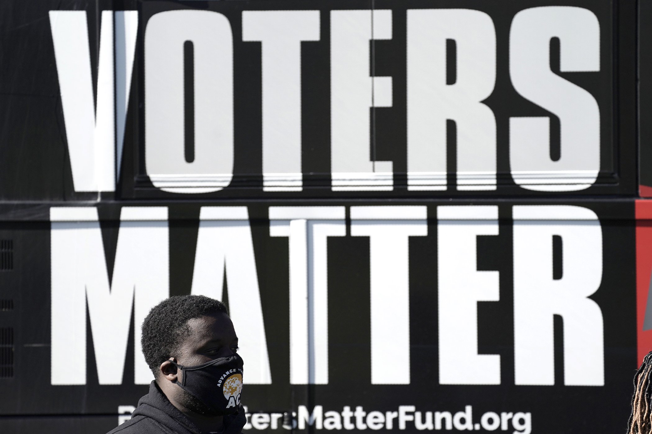 A man wearing a mask gathers with a group in support of Black Voters Matter at the Graham Civic Center polling site in Graham, N.C., Nov. 3, 2020.