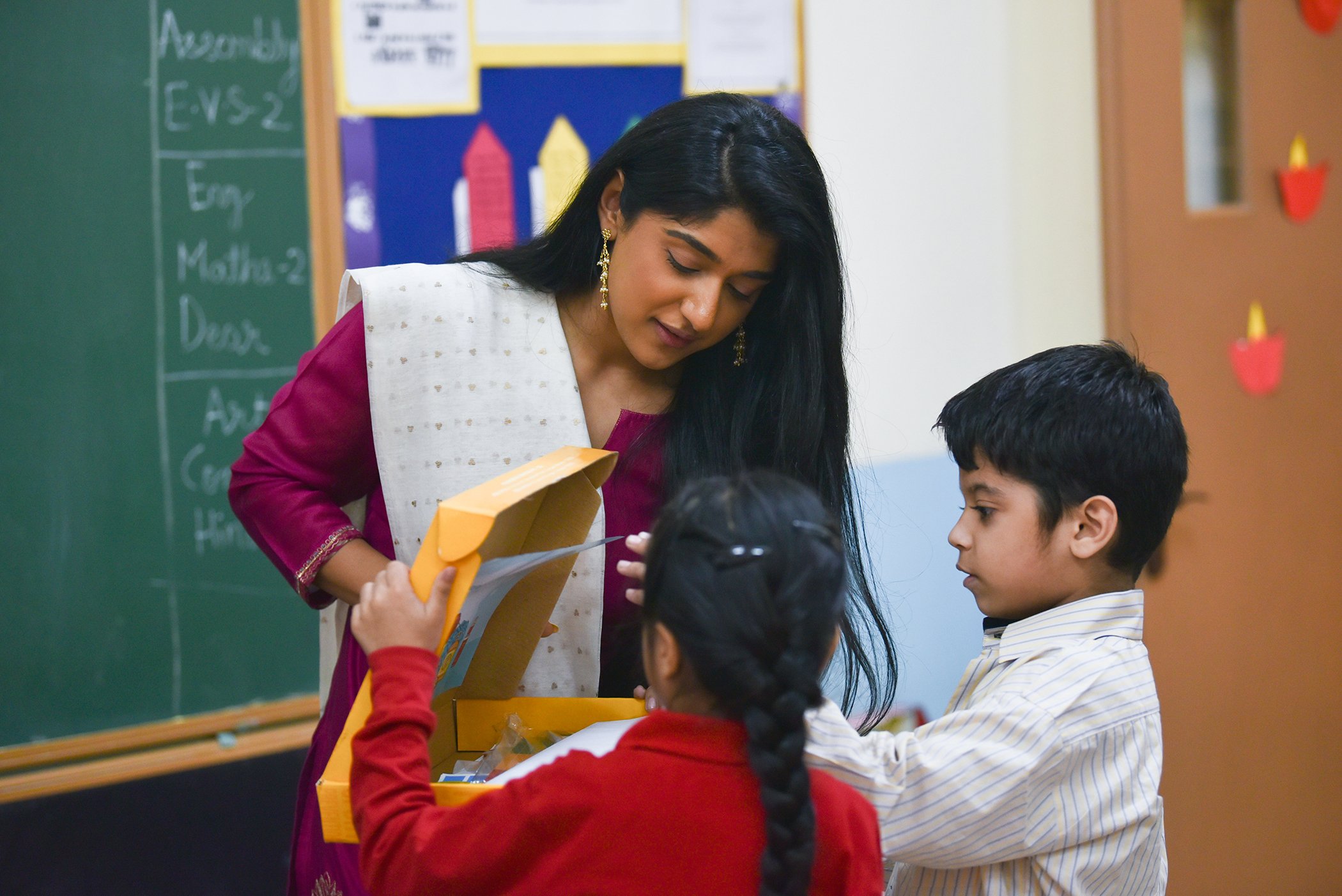 Priya Prakash shows students at Shriram Millennium School the “HealthSetGo” box, which includes fun activities for educators to teach hand-washing and the dangers of unhealthy food.