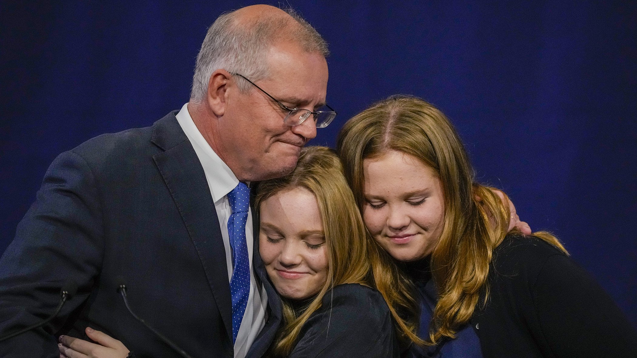 Former Australian Prime Minister Scott Morrison hugs his daughters Lily and Abbey at a Liberal Party function in Sydney, Australia, on Saturday, May 21, 2022.