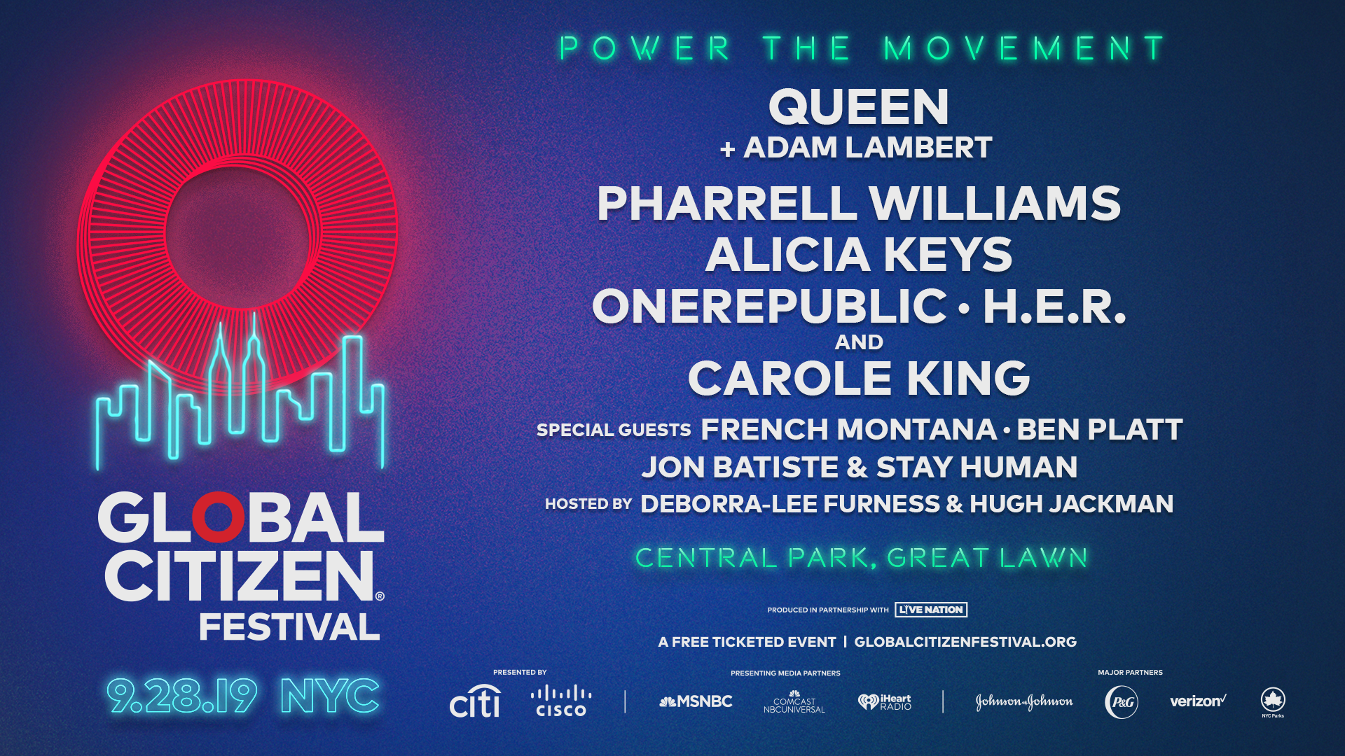 The 2019 Global Citizen Festival in New York will be presented by Citi and Cisco and in association with our Production Partner, Live Nation. MSNBC, Comcast NBCUniversal, and iHeart will serve as Presenting Media Partners and will air a live simulcast of the Festival on MSNBC and on iHeart Radio Stations. The Festival will also be livestreamed on YouTube and Twitter, presented by Johnson & Johnson.