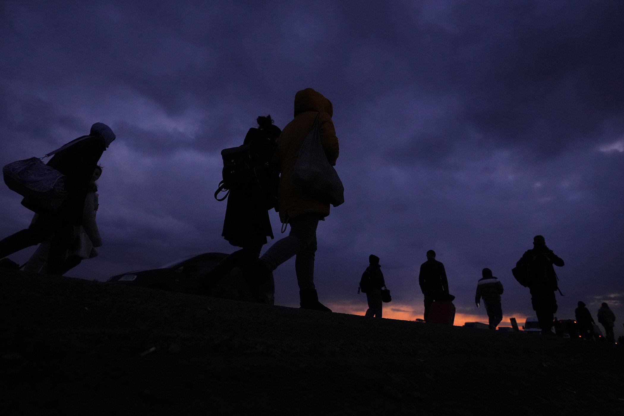 Refugees fleeing conflict in neighboring Ukraine arrive to Przemysl, Poland, Feb. 26, 2022.