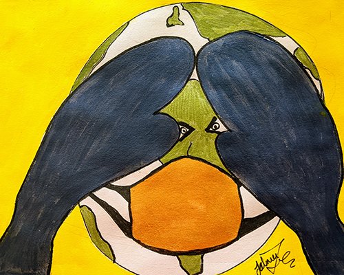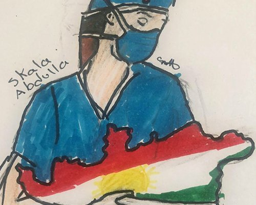 A health worker cradles the flag of Kurdistan; an ochre flower blossoms in a cracked, broken vase; a red-headed woman in a face mask holds the world close.