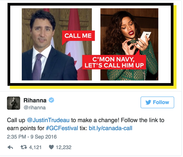 A month later, just days before the Global Citizen Festival in Central Park, while iterating the importance of education with Usher at his side, Trudeau playfully alluded to the barrage of Global Citizen communication he’d had to contend with, “Lately my office has been flooded with texts, calls and emails ... thanks Rihanna.”