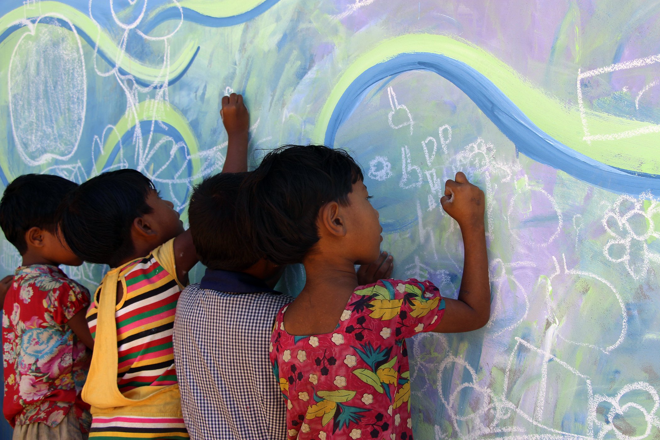 Along with his team of local Rohingya artists, Frieder worked with hundreds of kids to produce four community murals in the Balukhali camp. The four artists he worked with have continued to put together similar projects in other parts of the camp, he said.