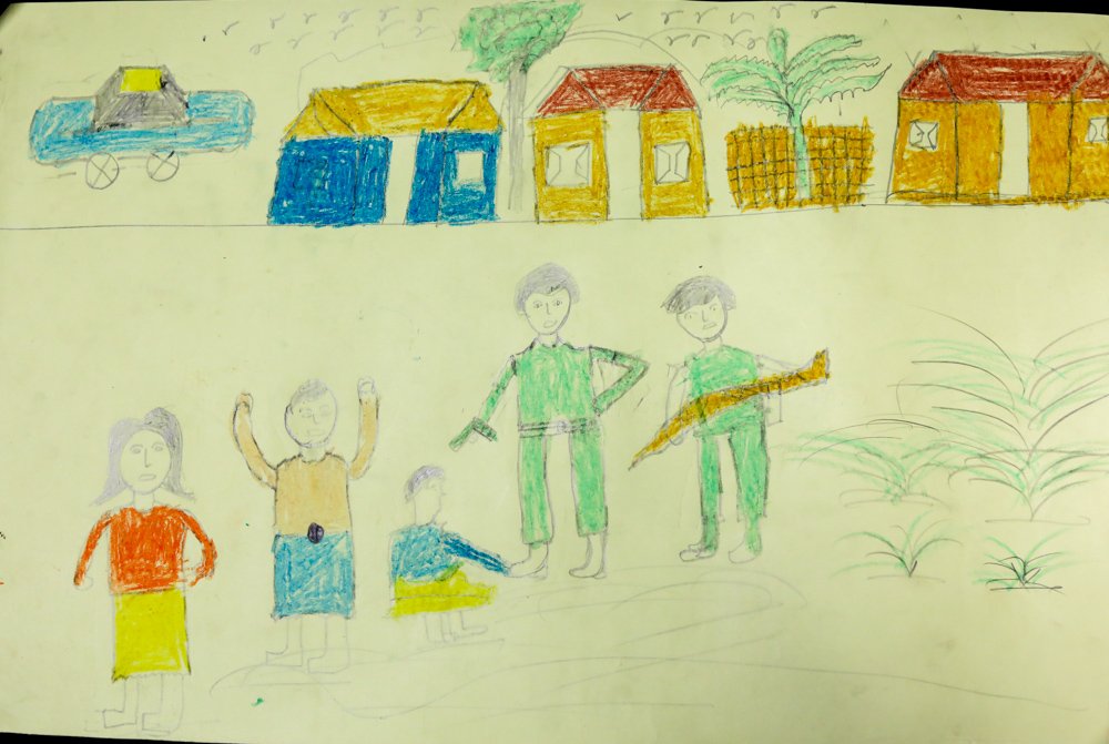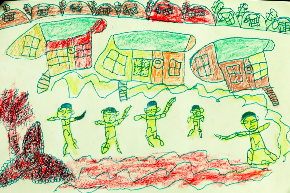 “This picture is showing people shooting, burning our houses, and killing people. We are not allowed to go to school in Myanmar. When I grow up I want to study, I want to be a teacher.”