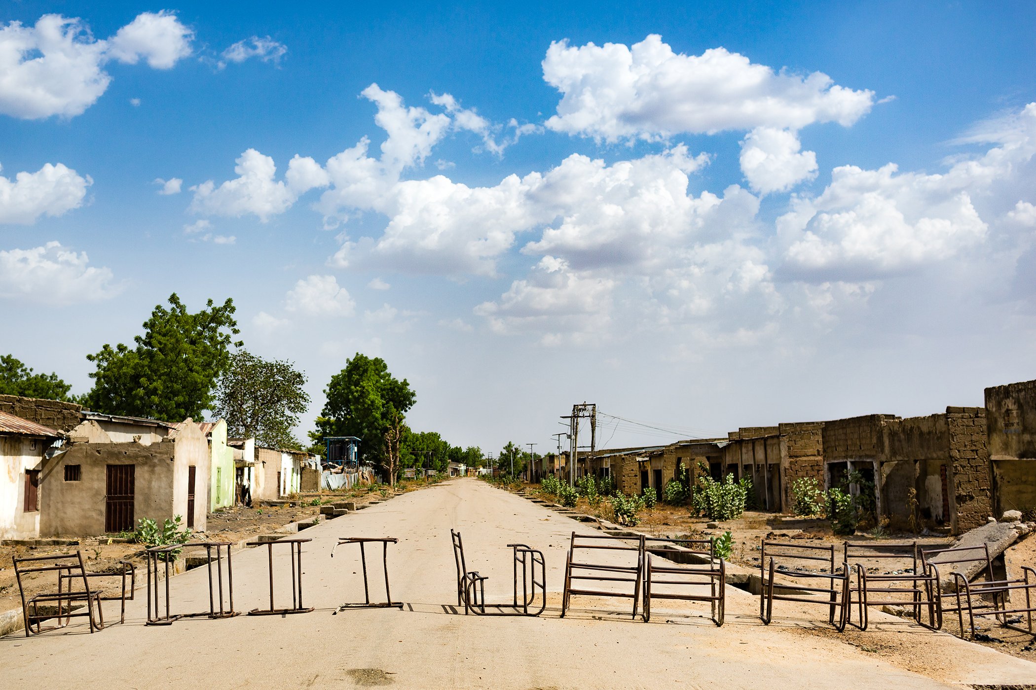 A row of old desks lies across the road on the outskirts of Banki town in northeast Nigeria on May 1, 2019. Beyond the desks, homes and shops are deserted due to insecurity and the dangers that lie beyond.