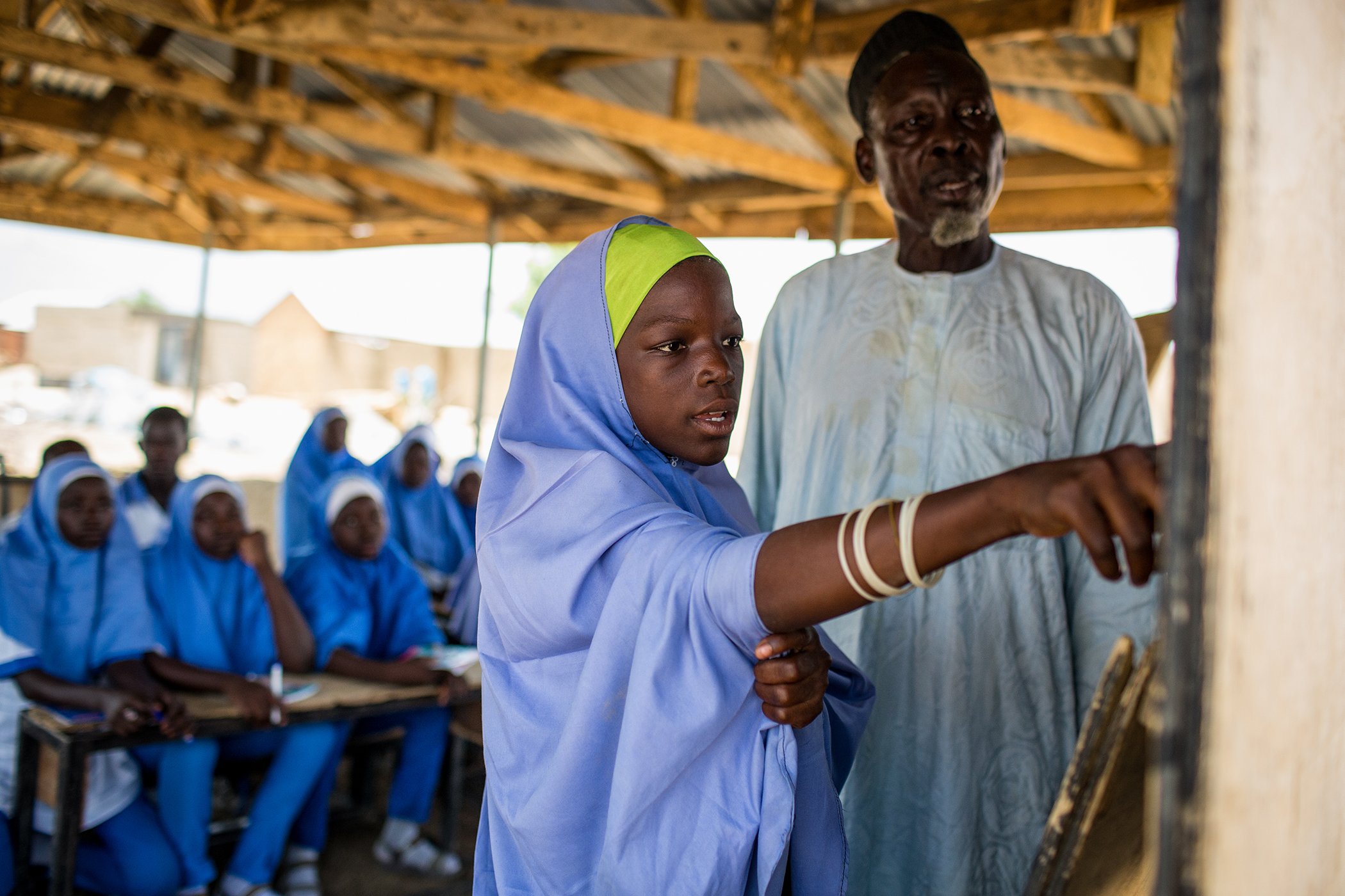 Hawa, 12, points at the blackboard during class at Sabo Garawi Primary School in Gwoza, northeast Nigeria, while her teacher Al Haji El Saddiq looks on, May 2, 2019. When Gwoza was captured by militants four years ago, Hawa fled the town and spent 3 months keeping a low profile until the town was recaptured by the Nigerian military. “The militants destroyed everything in the school." Hawa says. "I just thought that my future was over. When the town was recaptured by the military, after 2 months UNICEF provided a learning center. I was very happy because the school was close to home. I go to school to learn, to help the community to learn."