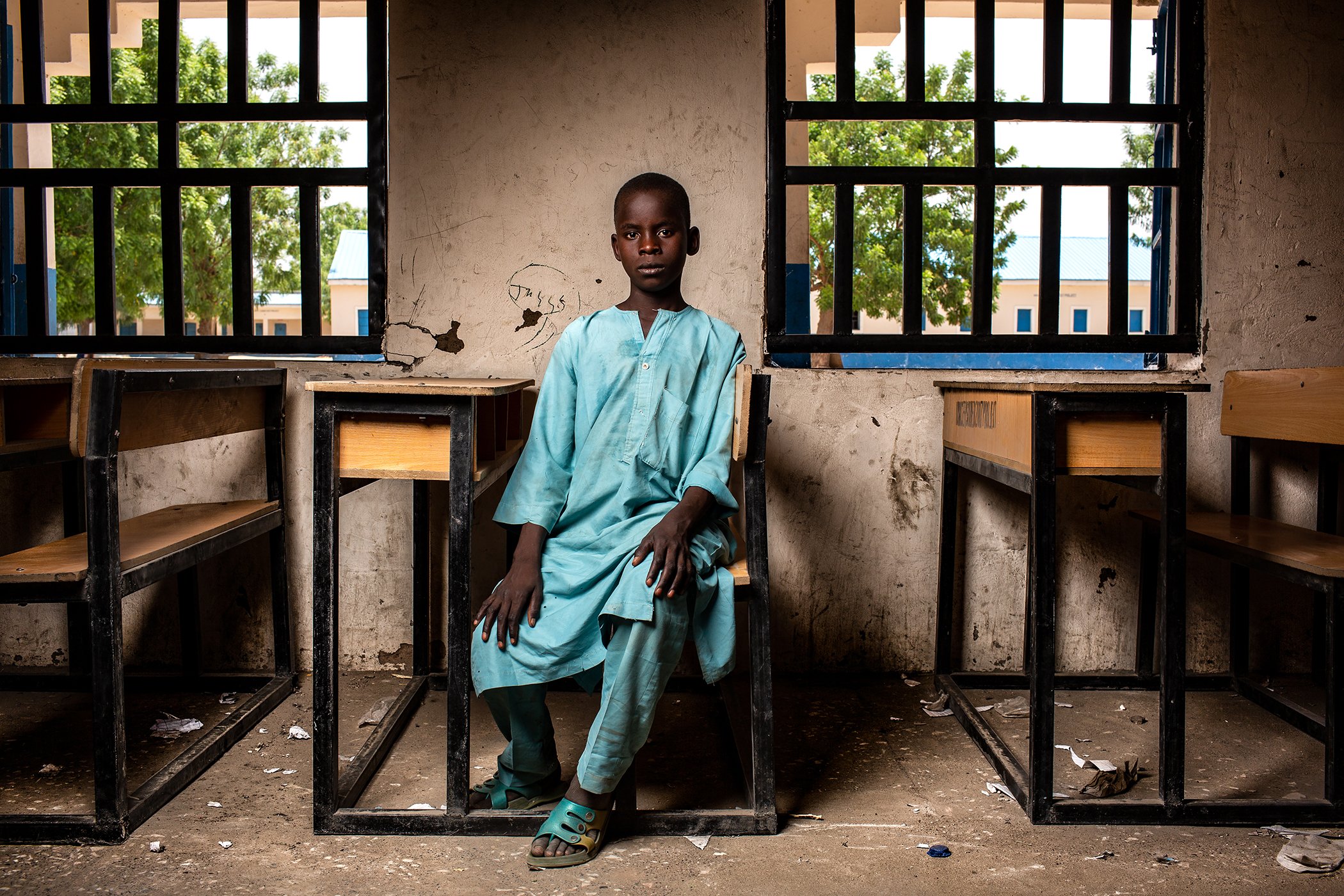 Mohammed, 12, sits in a classroom in Banki, northeast Nigeria on May 1, 2019. He first fled Banki when his school was attacked and set on fire. “I was at school and then I heard shouting and we ran. A classmate of mine opened the gate,” he explains. “They destroyed everything we worked on in our books, and they burnt them. One of my schoolteachers was killed.” Mohammed and his family took refuge on the other side of the border in Cameroon, where he attended school on and off for a while. Now Mohammed is now back home in Banki. Although the town it still is considered one of the most dangerous places in Borno State, its local primary school has reopened. Refurbished with support from UNICEF, it has been designed with security and safety for children in mind – including a high perimeter wall, entry and exit gates.