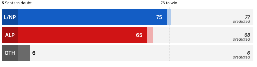 It is unknown whether the Coalition will govern Australia as a majority government. The Coalition, which currently holds 75 seats, needs to secure at least one of the remaining five seats still in doubt. If it fails to do so, the Coalition will be forced to work in combination with independent MPs as part of a minority government. Labor, at this stage, has secured 65 seats.