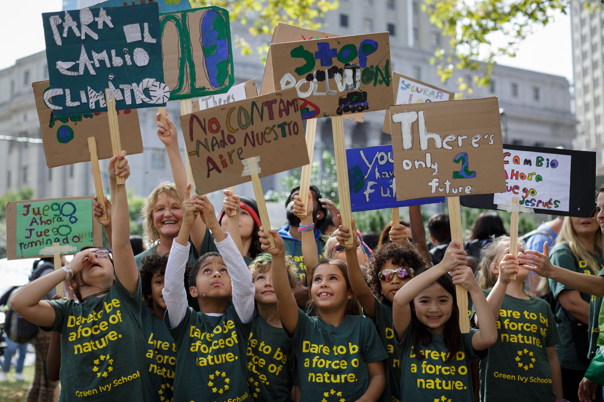 Students hold signs during the Global Climate Strike demonstration in New York, NY., on Sept. 20, 2019.