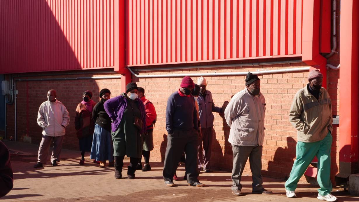 Pensioners stand in a queue to receive their monthly grant in vaccine in Soweto, South Africa. June 3, 2021.