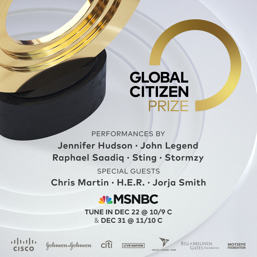 Proud partners of the Global Citizen Prize include Comcast NBCUniversal, MSNBC, Cisco, Johnson & Johnson, Citi, Live Nation, Reckitt Benckiser (RB), the Bill & Melinda Gates Foundation, and the Motsepe Foundation.