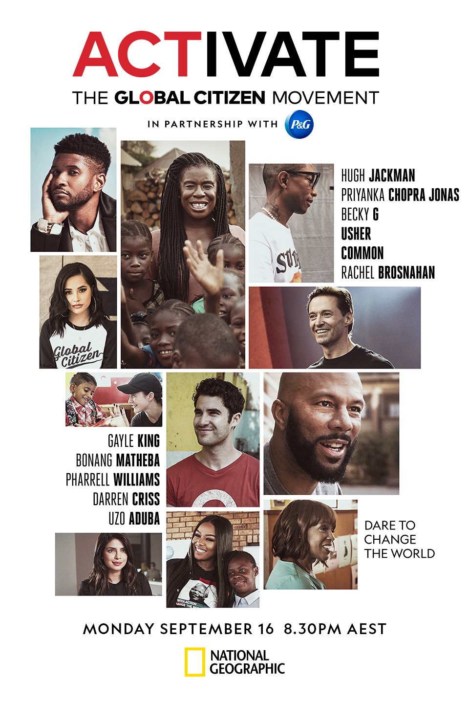 ACTIVATE: THE GLOBAL CITIZEN MOVEMENT will air weekly in select markets beginning Sept. 5 on the National Geographic channel or globalcitizen.org/activate. ACTIVATE will air in Australia on Sept. 16 on National Geographic Australia at 8.30 PM EAST.
