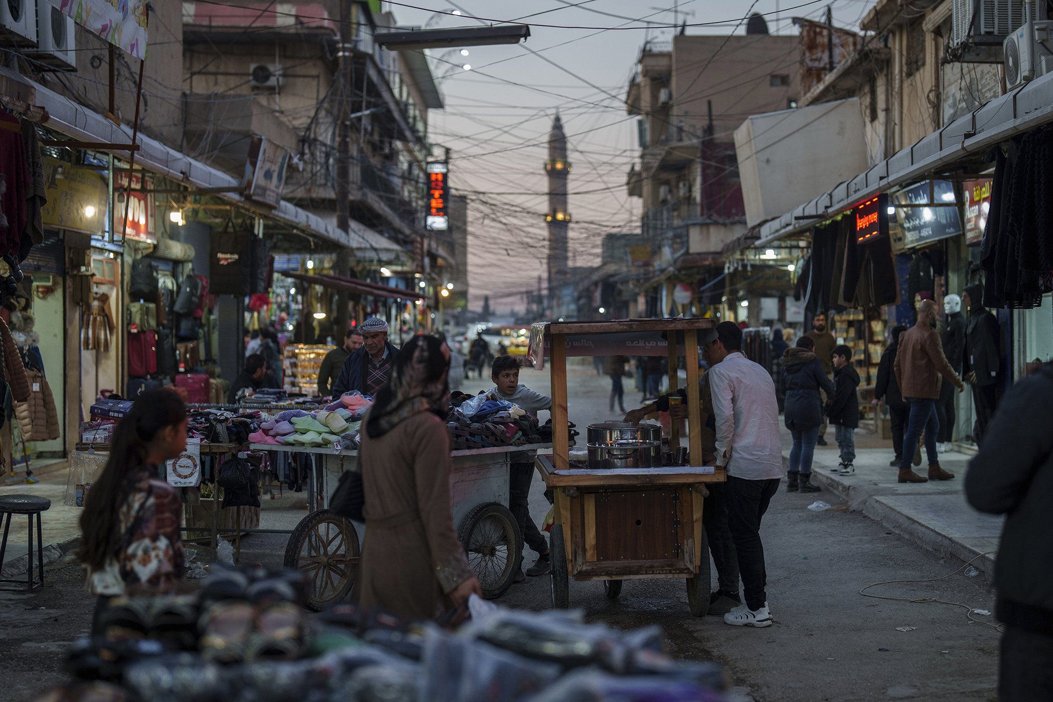 People stroll through a local market in the northeastern Syrian city of Qamishli, which is controlled by the U.S.-backed, Kurdish-led Syrian Democratic Forces, Jan. 28, 2025.