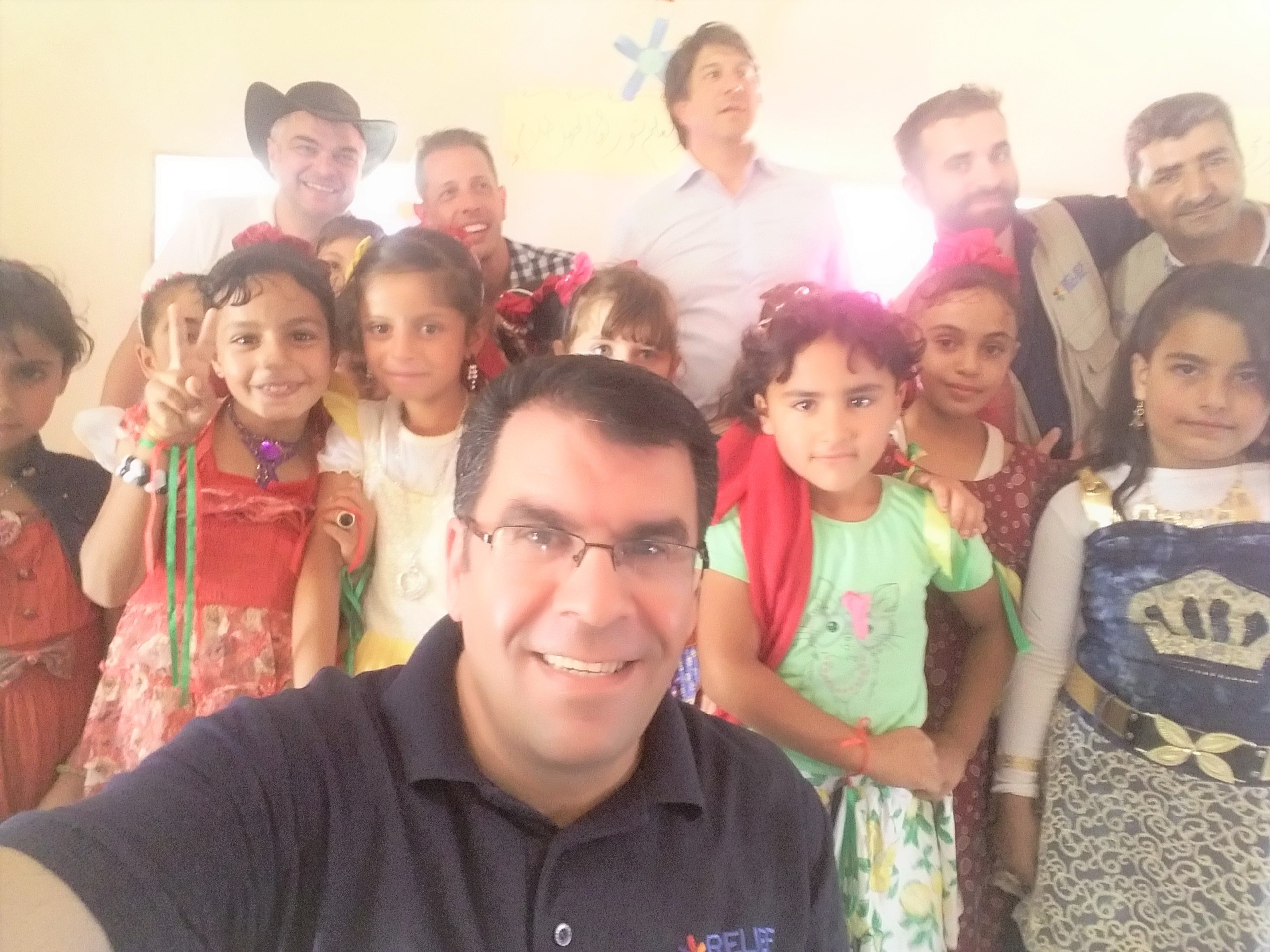 Dr. Ahmad Rababah with some of the children supported by Relief International in Jordan's Azraq and Za'atari refugee camps.