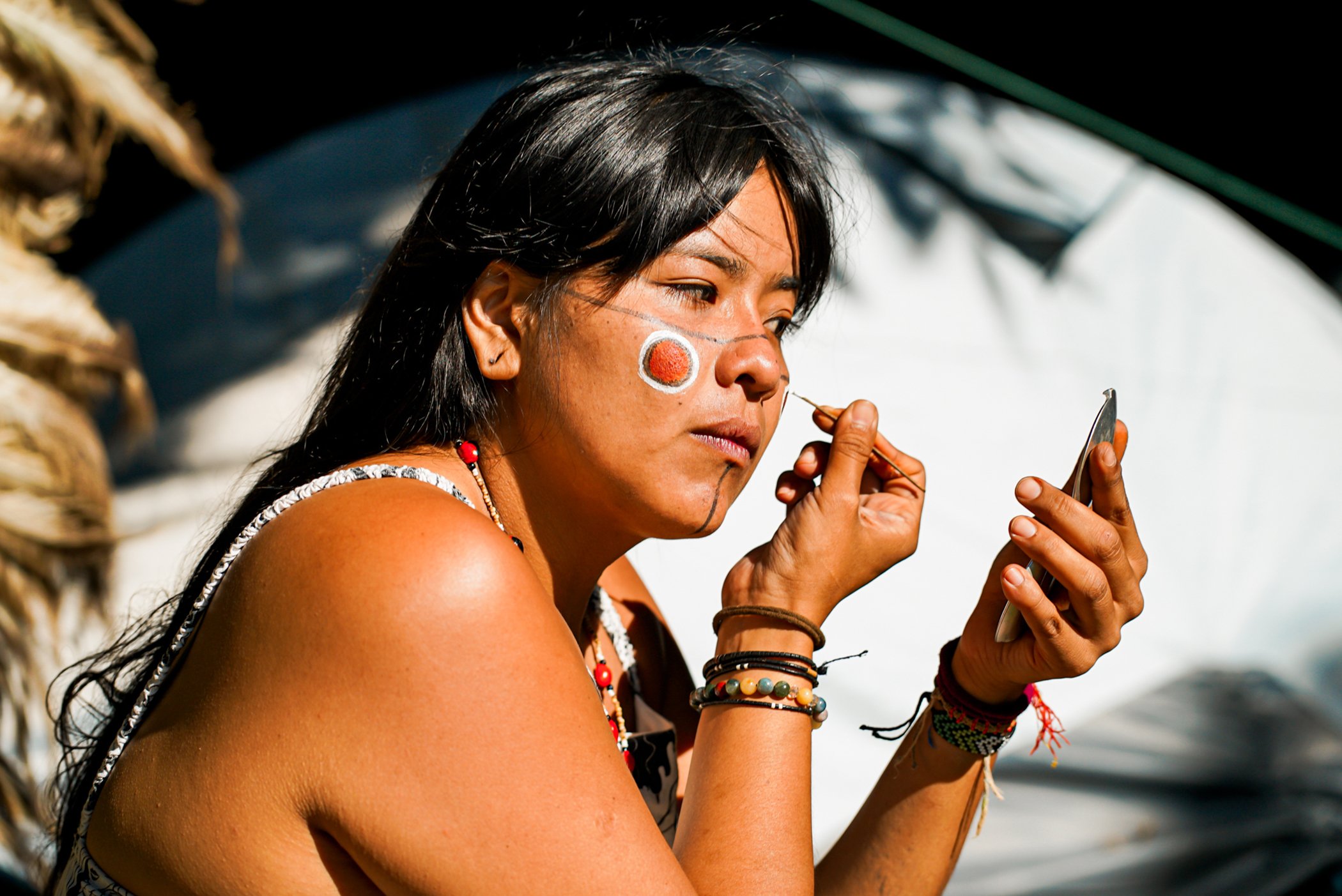 Taily Terena, paints her face in preparation for an annual event with Indigenous community members in Brazil, 2025.