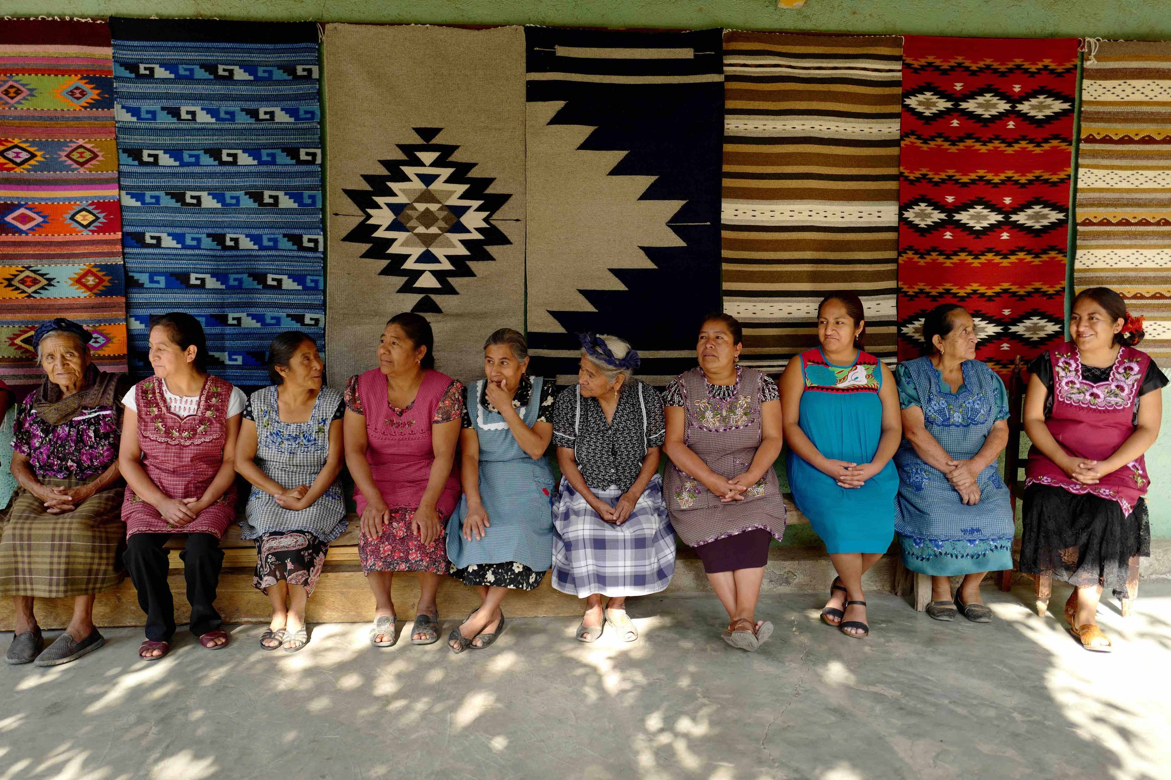Women weavers of the “Vida Nueva” collective in Teotitlán del Valle, Oaxaca, Mexico, sit on a bench in front of their work.