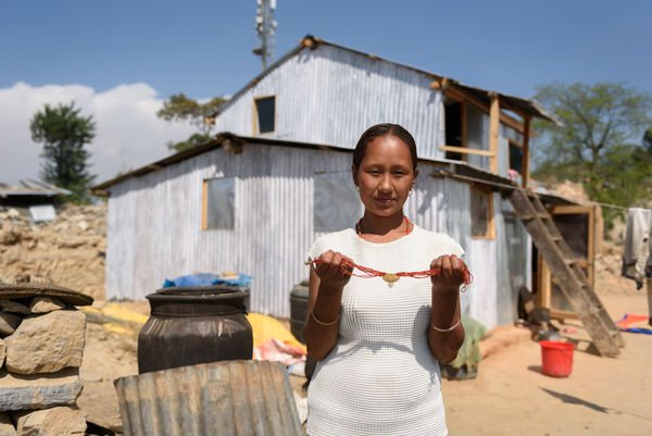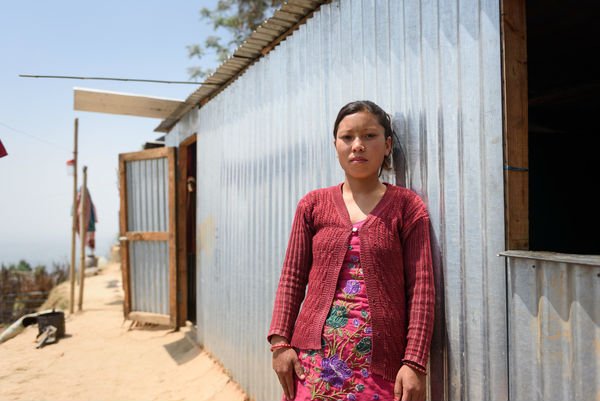 Prapti Tamang, 24, stands in front of the corrugated metal home her neighbors helped build after her two-story stone home was destroyed in the April 25 earthquake. Syauli Bazar, Nepal.