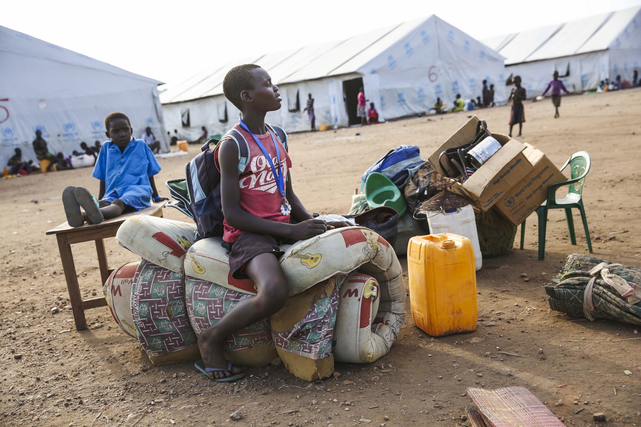 Young children wait to be processed at the Busia collection point near the Uganda/South Sudan border before their final destination of the Impvepi Refugee Camp in Busia, Uganda.