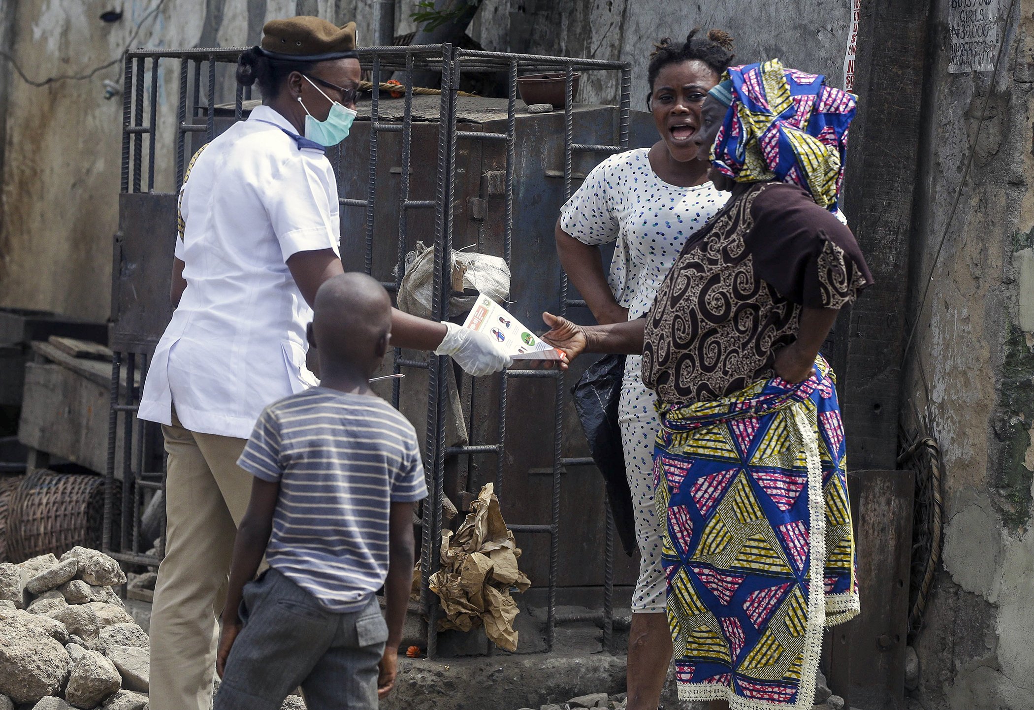 A health worker hands out leaflets on how people should protect themselves from the new coronavirus, in Lagos, Nigeria, March 31, 2020 as the city faces a two-week lockdown with residents told to stay in their homes.
