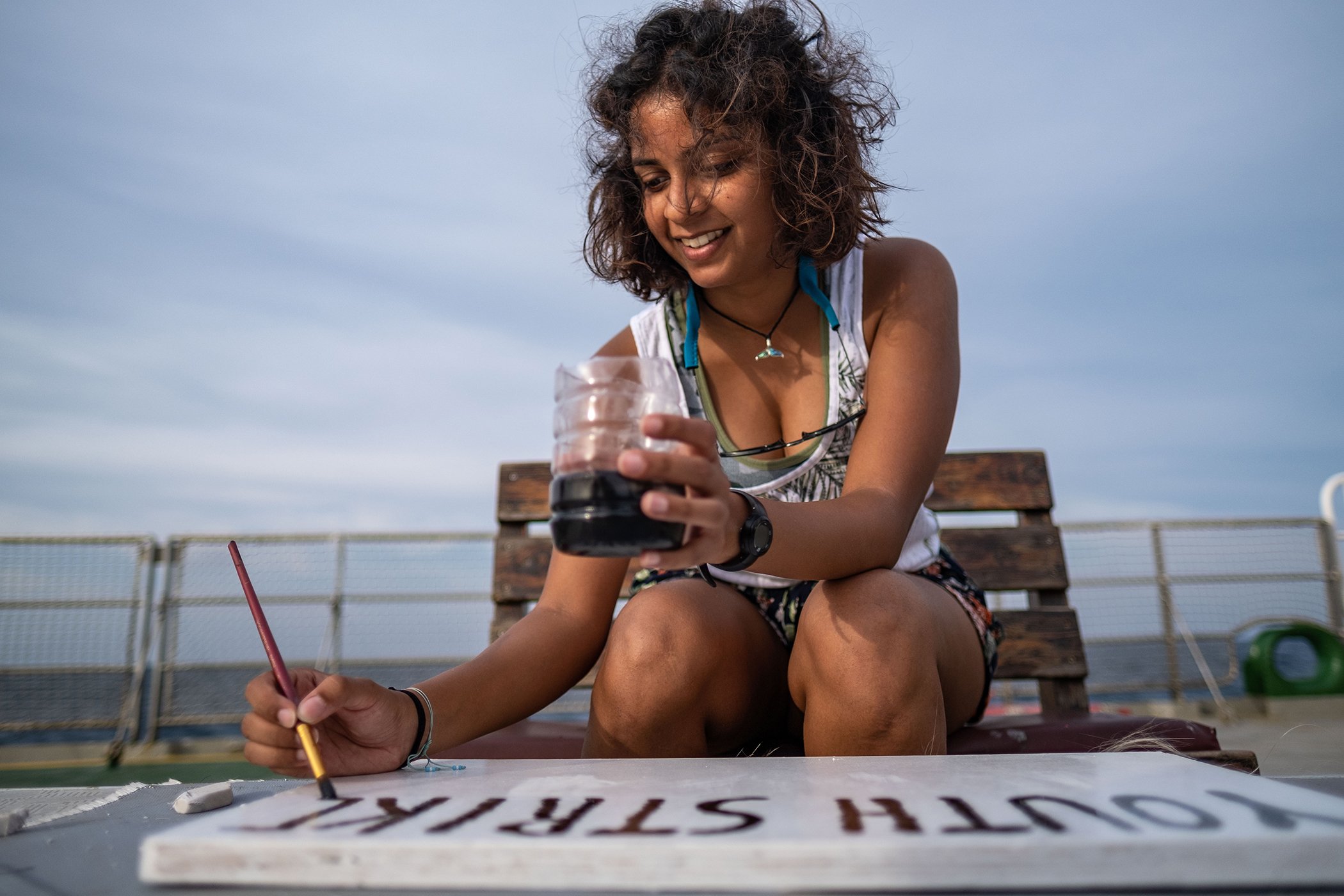 Shaama Sandooyea prepares her sign for the climate strike onboard the Arctic Sunrise in the Indian Ocean. A team aboard the ship are on an expedition to the bank to contribute to a better understanding of the wildlife and diversity of the region.