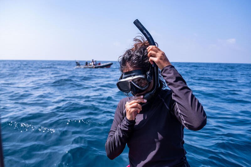 Climate advocate and scientist Shaama Sandooyea pulls on a mask and snorkel ahead of an underwater climate protest on the Saya de Malha bank in the Indian Ocean.