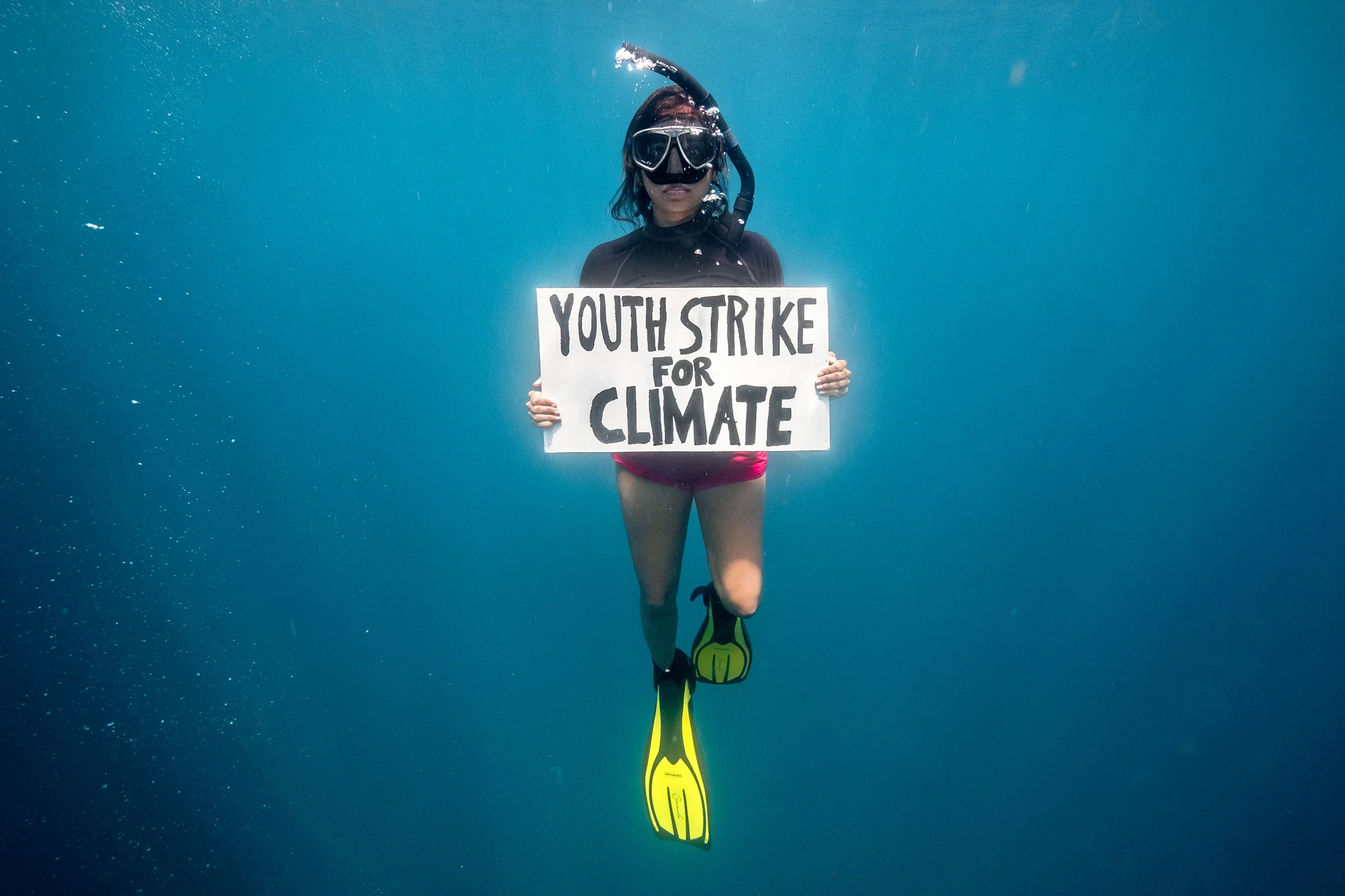 Earlier this year, striking images from the world’s first underwater protest against climate change began to appear on social media: an activist, wearing a mask and snorkel and floating at the heart of the Indian Ocean, holding up a sign reading “Youth Strike for Climate.”