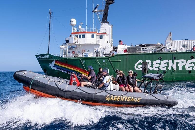 Climate advocate and scientist Shaama Sandooyea, Greenpeace crew and crew search for shallow areas on the Saya de Malha bank in the Indian Ocean ahead of performing an underwater climate protest.