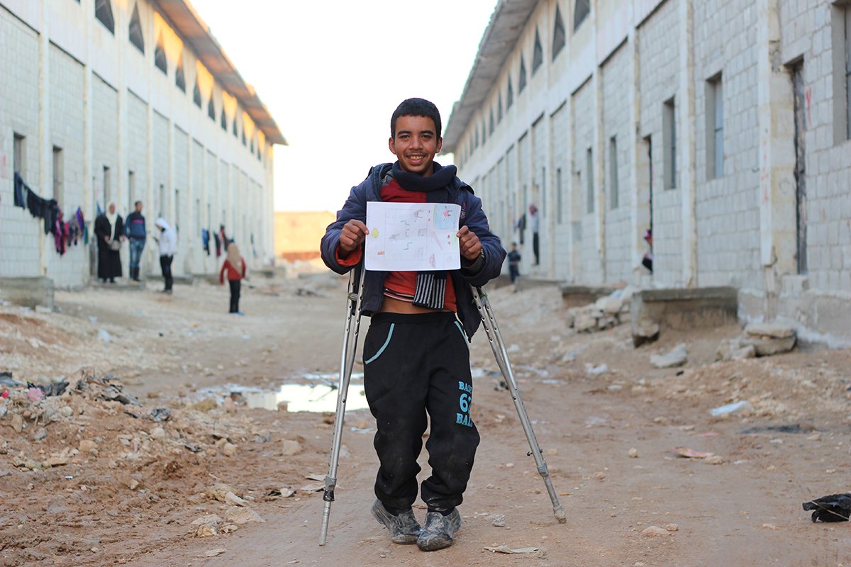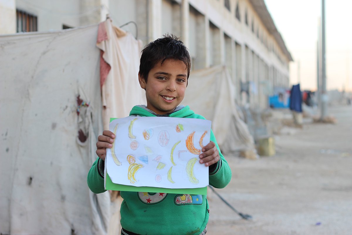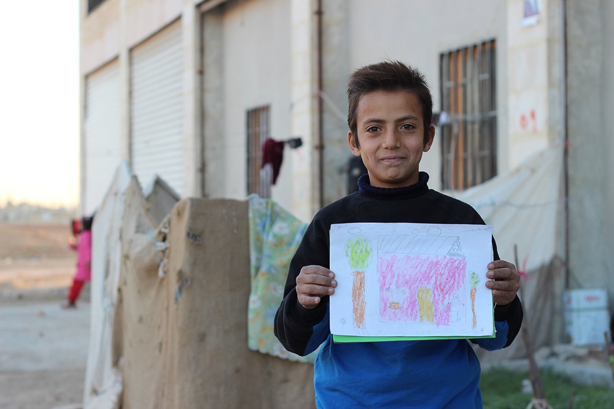 “I want a house with walls and two windows and a door,” says Abdulmajeed, 13, holding up his drawing, at a shelter for families displaced by the ongoing violence in eastern Aleppo city, in the Jibreen area on the outskirts of Aleppo city, Syrian Arab Republic, Friday 9 December 2016. Abdulmjeed arrived ten days ago at one of the shelters in Jibreen. Conditions at the shelter are basic with little protection from cold and rain.