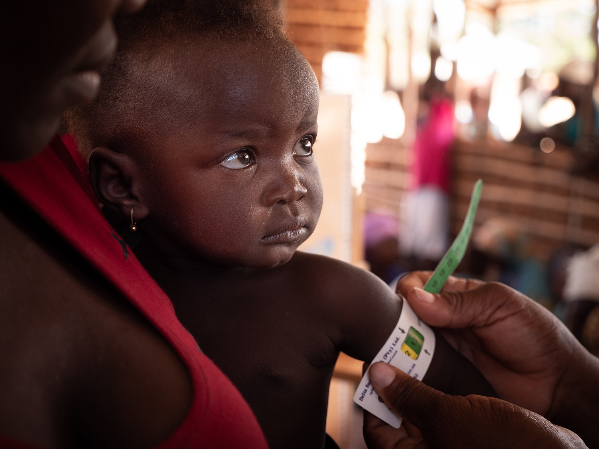 A girl has her mid-upper arm circumference measured by a health worker during a checkup at a community outreach medical clinic near the village of Mecufi, in northern Mozambique on Sept. 27, 2019.