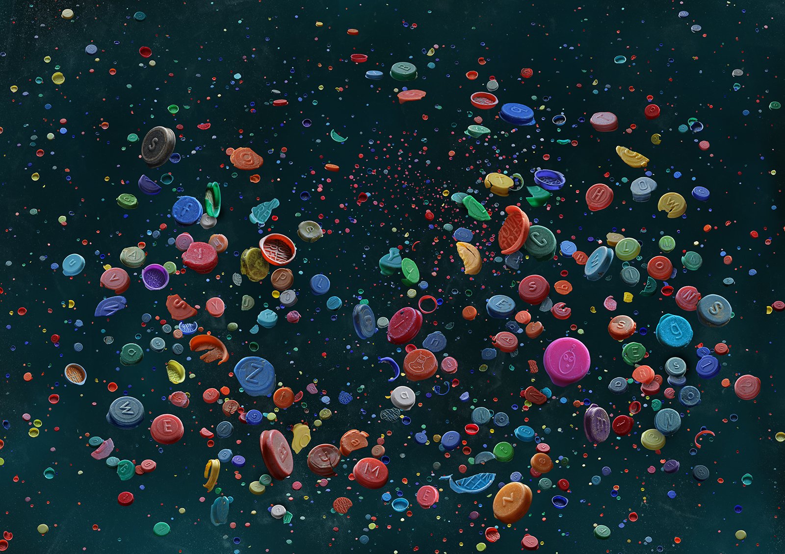 For a series of images, Barker created installations of specific types of plastic — toothbrushes, plastic straws, bottle caps, plastic wrappers, plastic plates — suspended against a black background. The scenes seem like stars in the sky or schools of fish upon first inspection, but a closer look reveals grimy stains, broken fragments, and uneven tears on pieces of plastic.