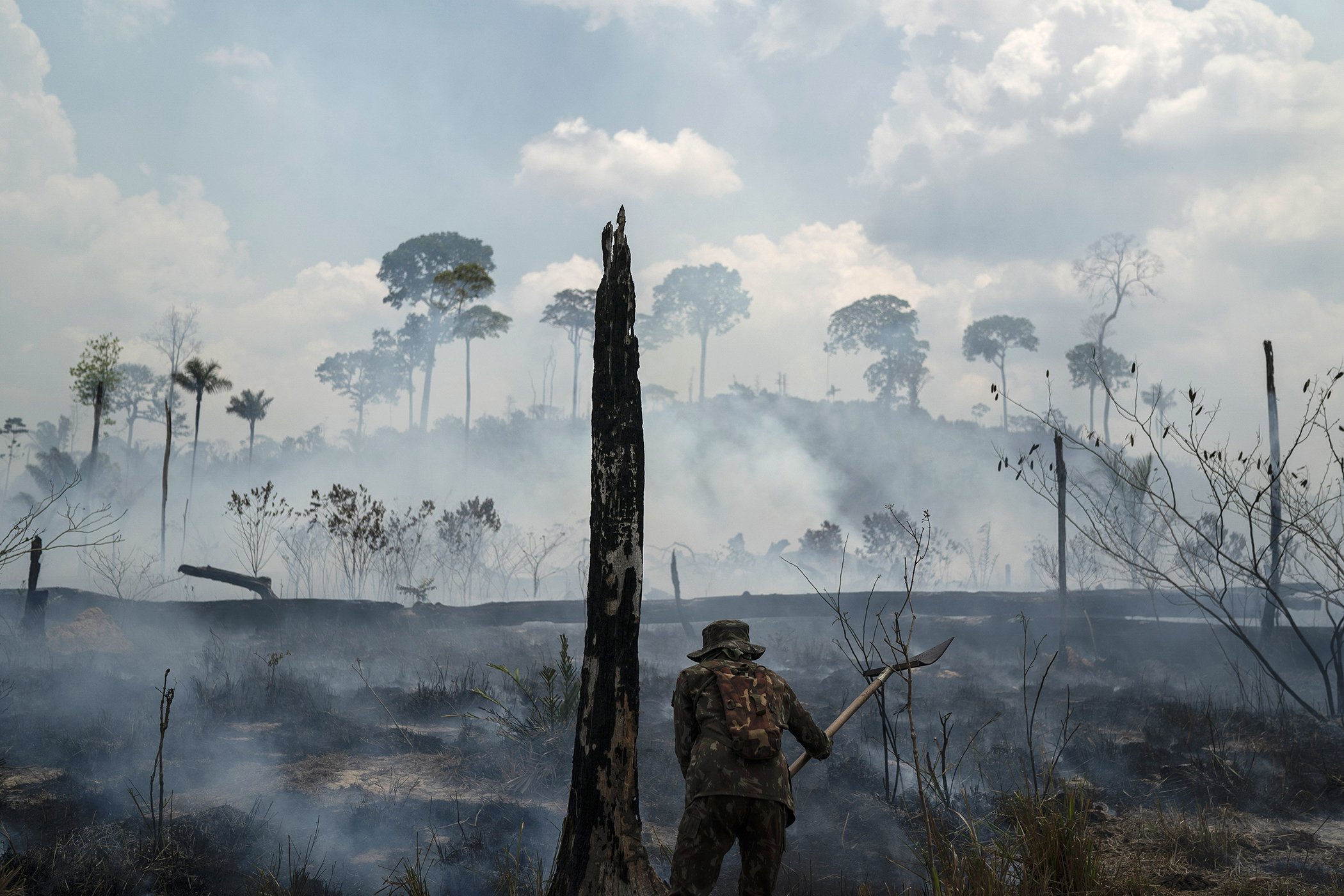 3. Amazon Fires Aftermath: A Brazilian soldier puts out fires at the Nova Fronteira region in Novo Progresso, Brazil, Sept. 3, 2019. Experts from the country's satellite monitoring agency say most of the fires are set by farmers or ranchers clearing existing farmland, but the same monitoring agency has reported a sharp increase in deforestation this year as well. More than 39,000 wildfires — a record number — have been documented so far this year, a 77% increase from the year before. The fires have prompted international outcry and Brazilian President Jair Bolsonaro sent the military to help extinguish some fires. Last week, he also passed a decree banning most fires for land-clearing for a period of 60 days, although he later limited the ban to the Amazon.