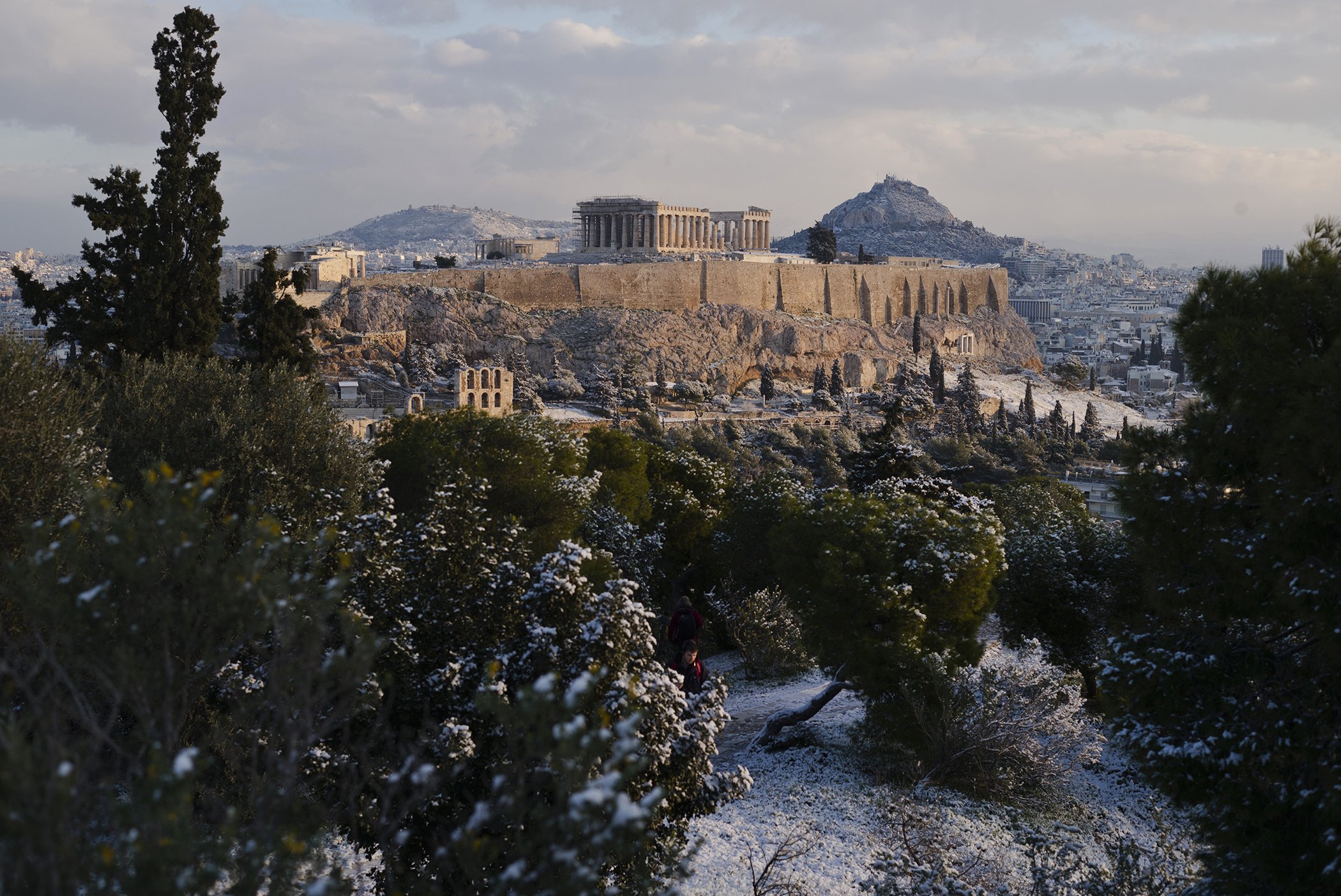 6. Winter Weather in Athens: A man walks at Filopappos hill as, in the background, the ancient Acropolis hill is seen with the 500BC Parthenon temple, after a snowfall in Athens on Jan. 8, 2019. Athens got a dusting of snow this week as temperatures across Greece hit record lows.
