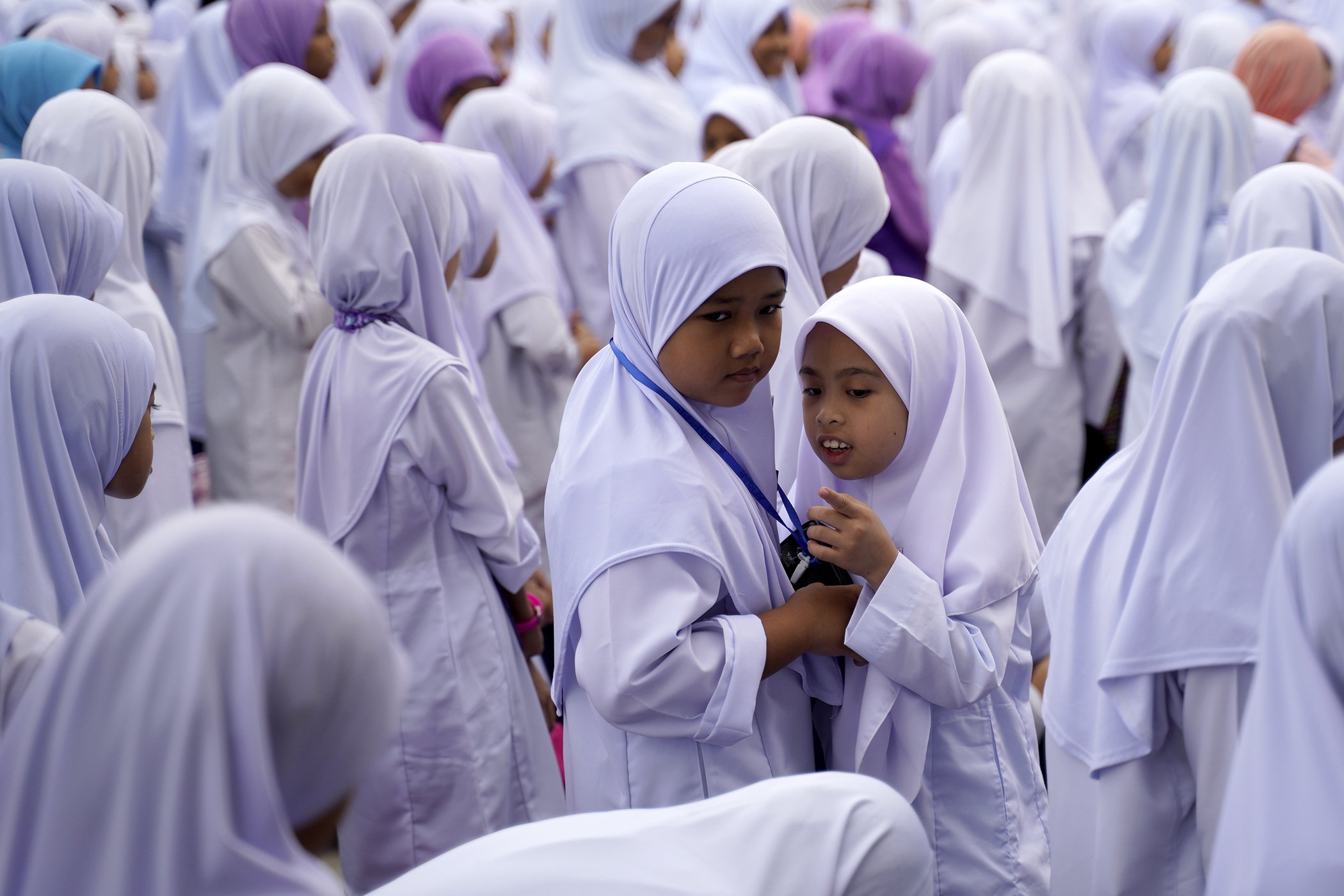 Primary school students talk during the first day of the new school session in Putrajaya, Malaysia, Wednesday, Jan. 2, 2019. Malaysia began the first day of new school session on Jan. 2.