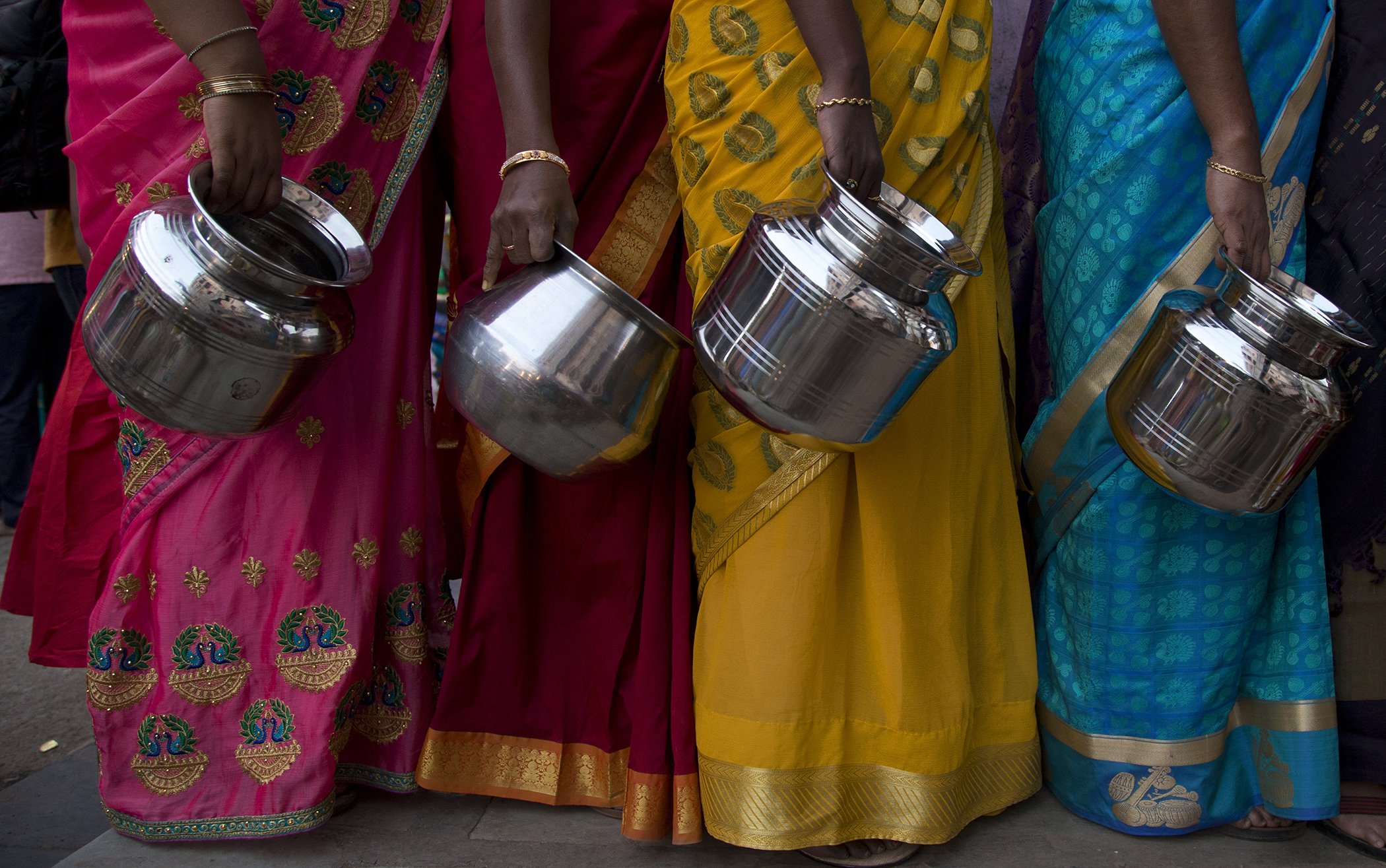 Indian Tamil Hindu women hold utensils as they wait in a queue to collect water to cook special food to celebrate the harvest festival of Pongal at Dharavi, one of the world's largest slums, in Mumbai, India, Tuesday, Jan. 15, 2019. This celebration, held according to the solar calendar, marks the beginning of the sun's northward movement and is considered to be auspicious.