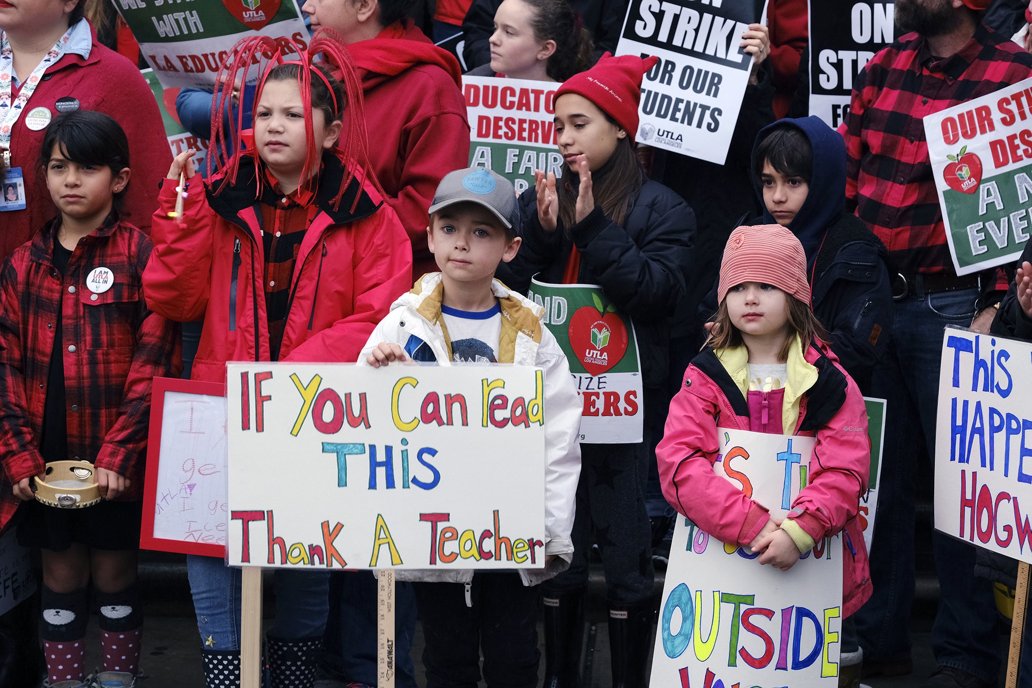 Elementary school students, Capri Mac, right, and her brother Sawyer, second from right, stand in support of a teachers in front of Hamilton High School during a city wide teacher strike on Wed. Jan. 16, 2019.16 at Hamilton High School. Los Angeles school administrators urged the union to resume bargaining as tens of thousands of teachers planned to walk picket lines for a third day Wednesday, after being joined on strike for the first time by some of their counterparts from independent charter schools.