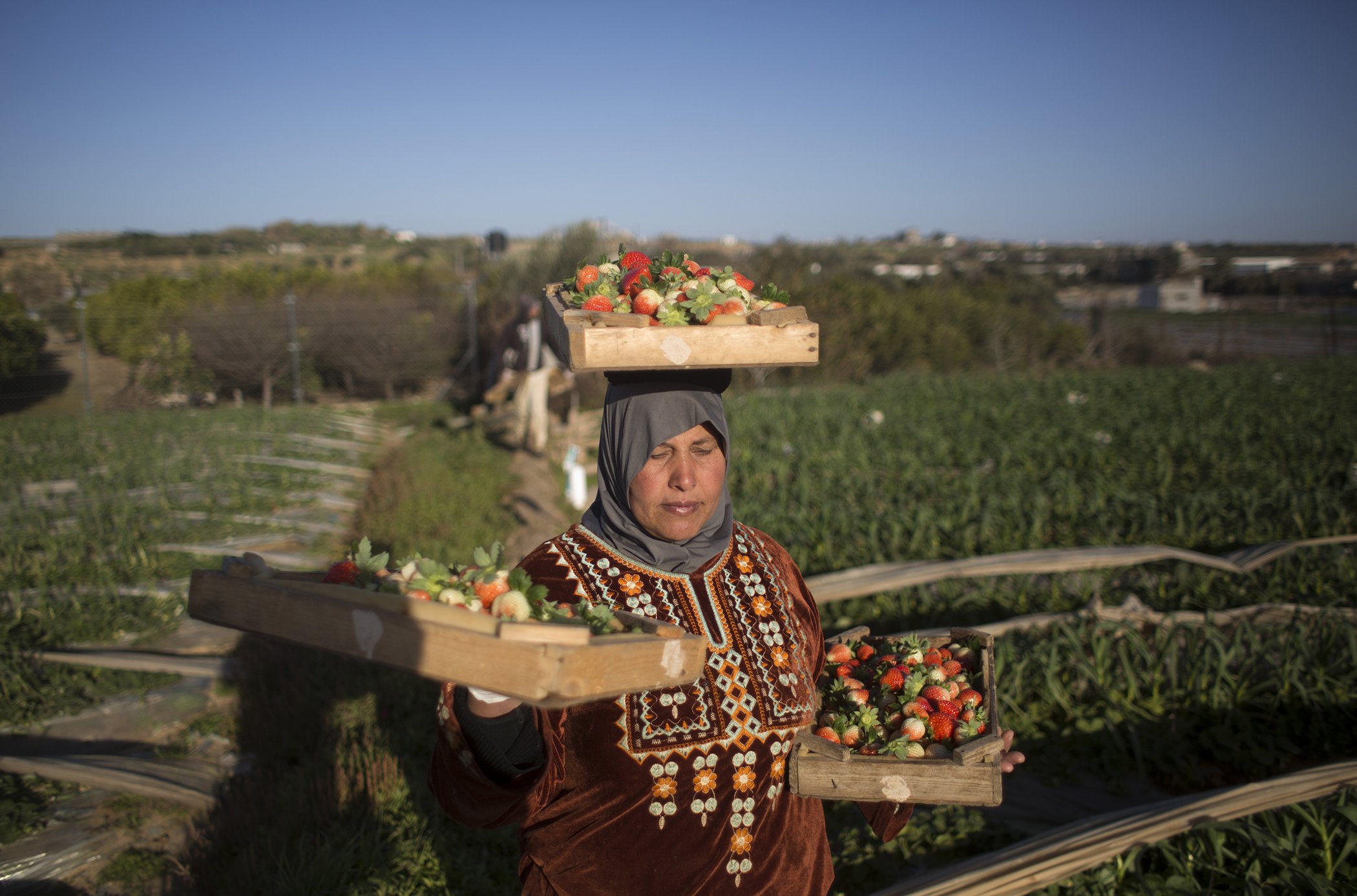 A Palestinian woman, employed by UNRWA, carries wooden trays filled with strawberries, at a farm, in the town of Beit Lahiya, Northern Gaza Strip, Jan. 15, 2019. The project, funded by the French Government aims to provide short term employment in agriculture to hundreds of poor Palestinians in Gaza Strip, where more than half the population are unemployed.