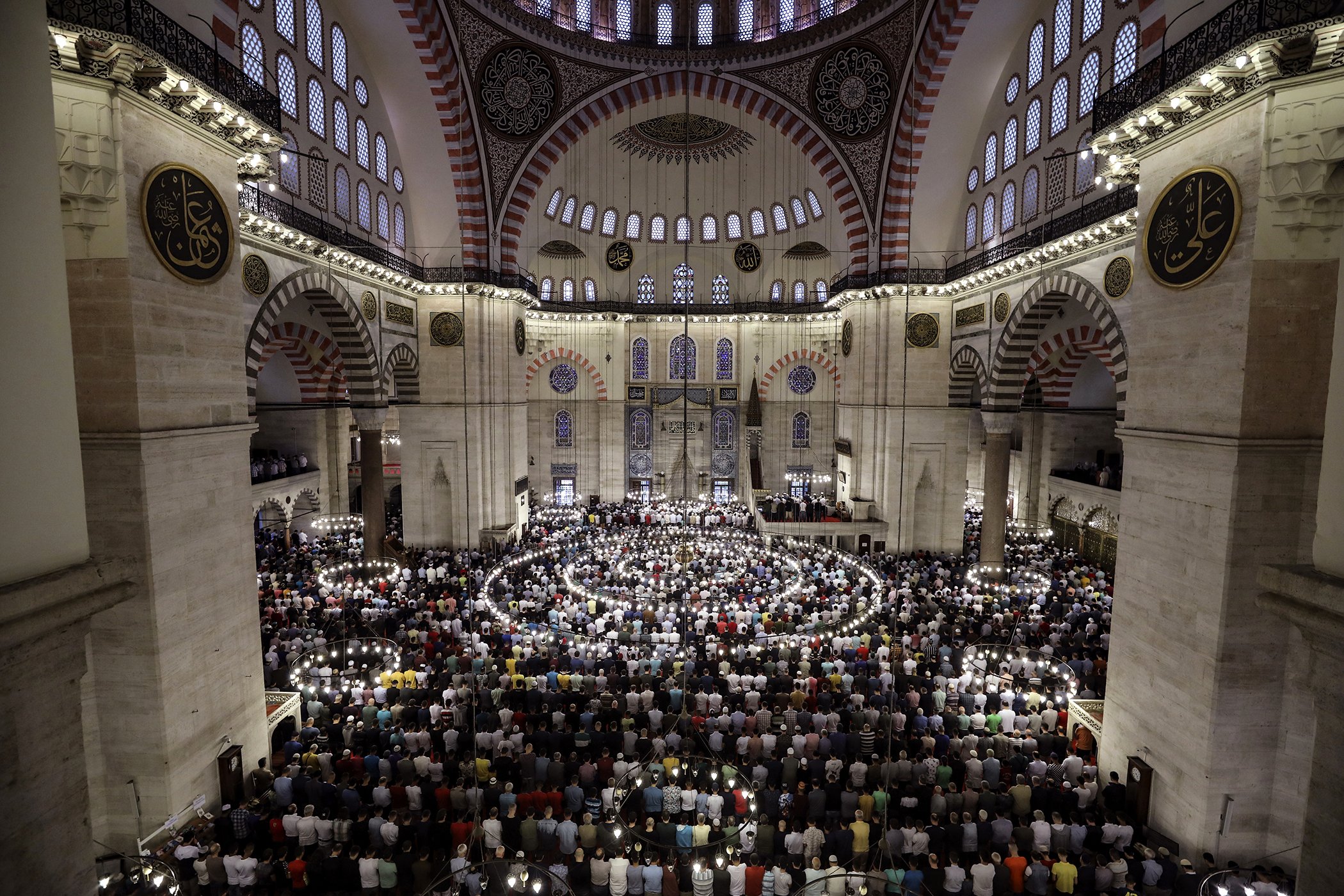 Turkey's Muslims offer prayers during the first day of Eid al-Fitr, which marks the end of the holy fasting month of Ramadan at the Suleymaniye Mosque in Istanbul, early on June 4, 2019.